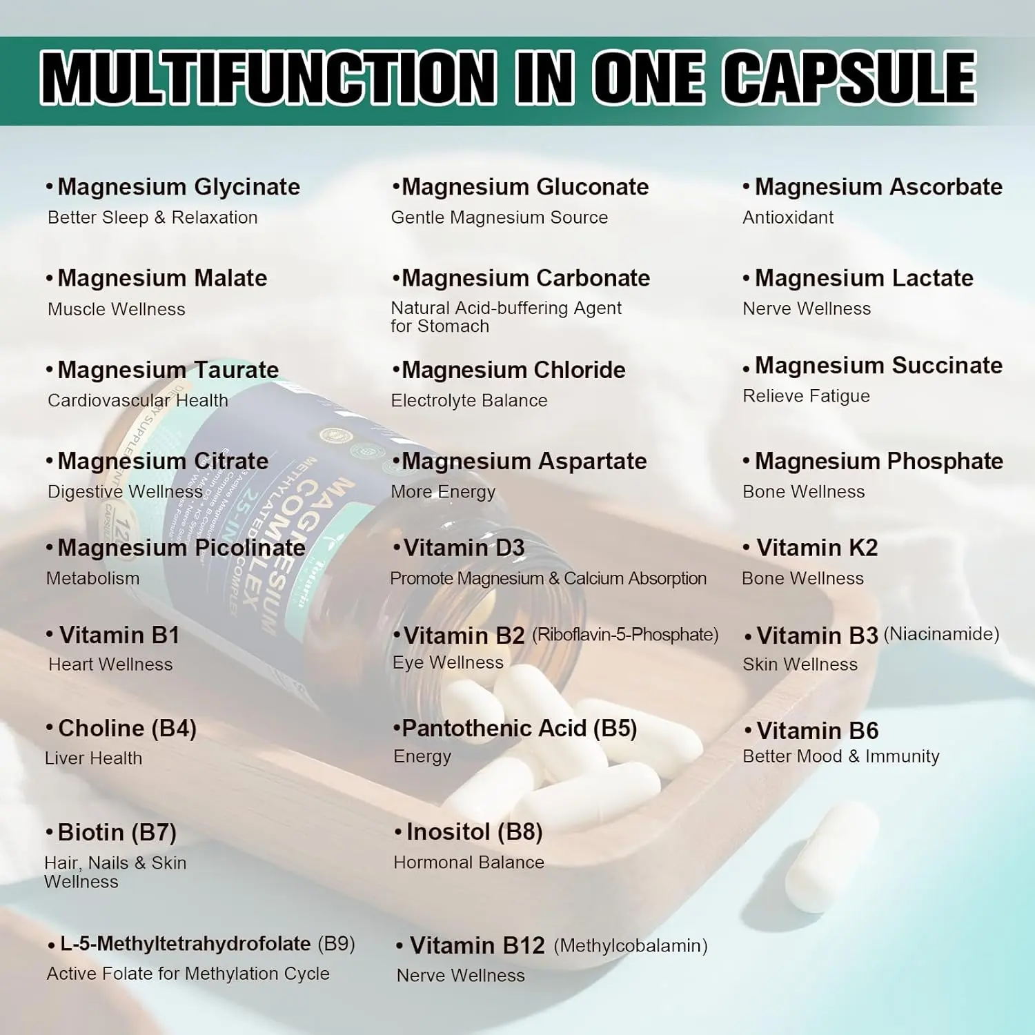 ·POWERFUL MAGNESIUM COMPLEX: Totaria 25-in-1 Magnesium Supplement with 13 Active Magnesium Types, Complete B-Complex & Vitamin D3 K2. 13-in-1 MAGNESIUM BLEND 1000MG per serving with MAGNESIUM GLYCINATE 400MG, Magnesium Malate 100mg, Magnesium Taurate 100mg, Magnesium Citrate 100mg, Magnesium Gluconate, Carbonate, Chloride, Aspartate, Ascorbate, Lactate, Succinate, Phosphate, Picolinate. Complete B-Complex with Vitamin B1, Vitamin B2, Niacinamide (B3), Choline (B4), Vitamin B5, Vitamin B6, Biotin (B7), Inositol (B8), Folate (B9), Vitamin B12.