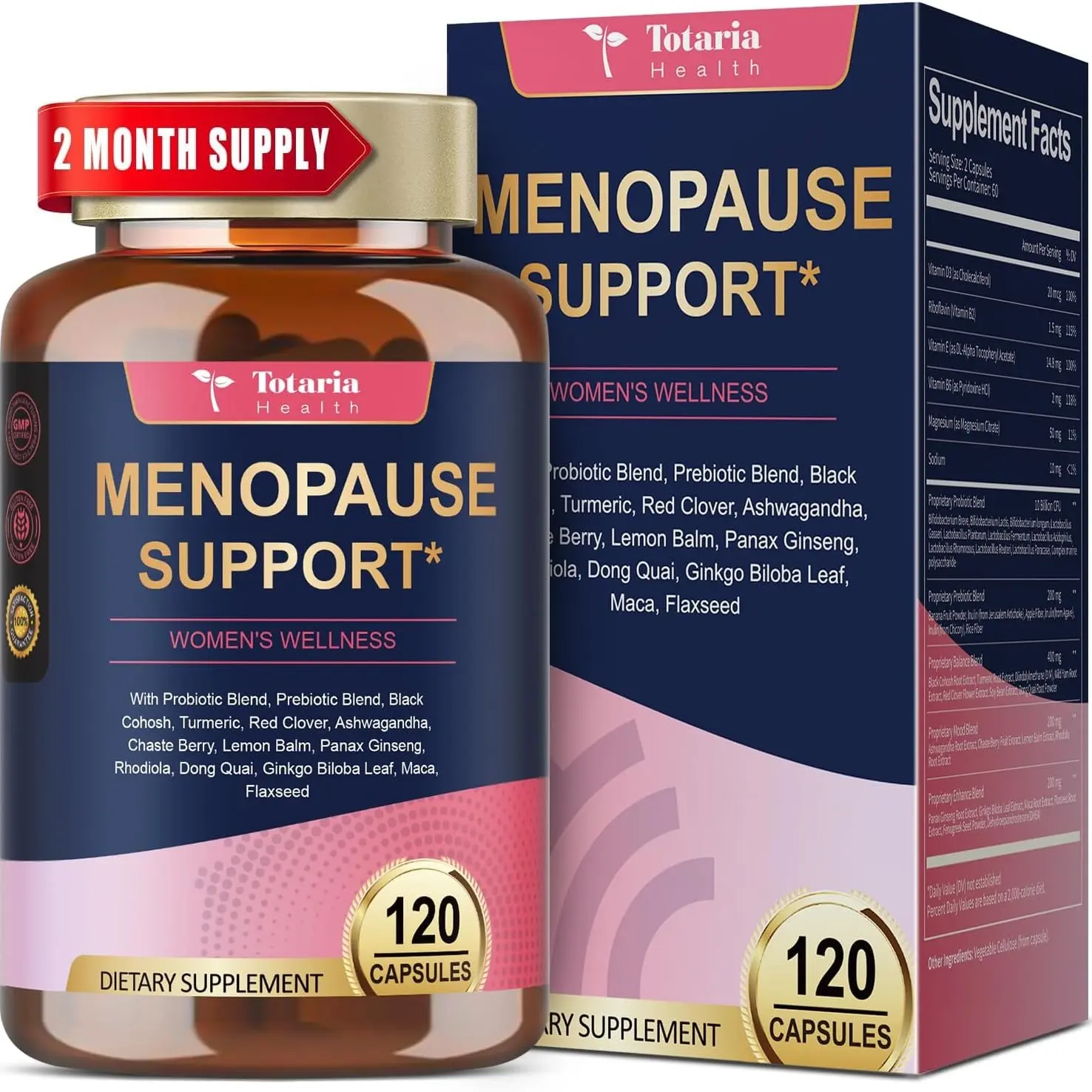 Energy & Mood Boost: A blend of Ginseng, Maca, B6, DHEA, and Turmeric supports energy, cognitive function, and emotional well-being during menopause, plus added Vitamins E and D.