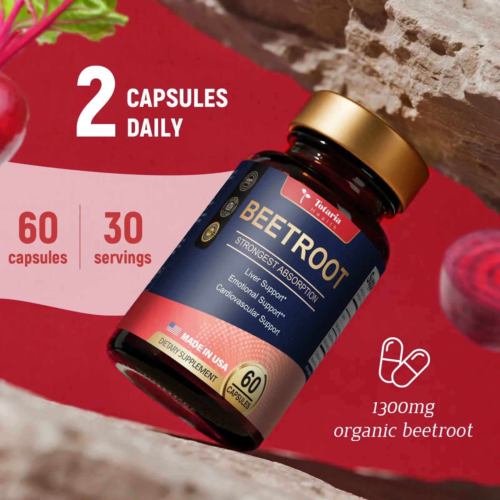 1300mg of Organic Beetroot Root per Capsule: Each serving of Totaria’s Beetroot Capsules provides 1300mg of high-quality organic beetroot powder, derived from nutrient-rich red beets. This effective, natural superfood offers a simple and efficient method to support your everyday wellness routine.