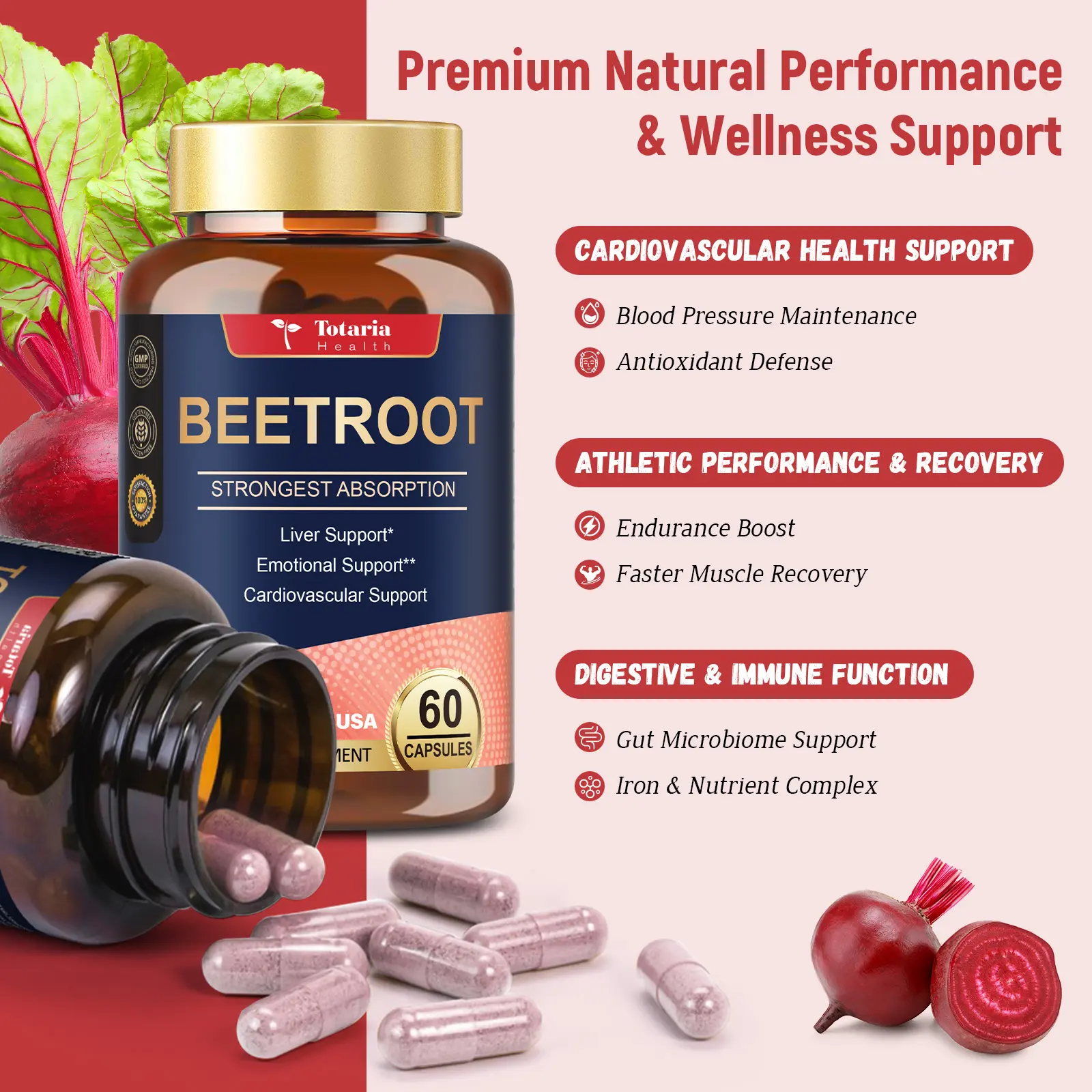 Promotes an Active, Well-Rounded Lifestyle: Whether you're a fitness lover, an outdoor enthusiast, or simply looking for clean energy, these beetroot capsules integrate easily into your daily regimen. A straightforward, powerful method to improve general wellness and vigor.