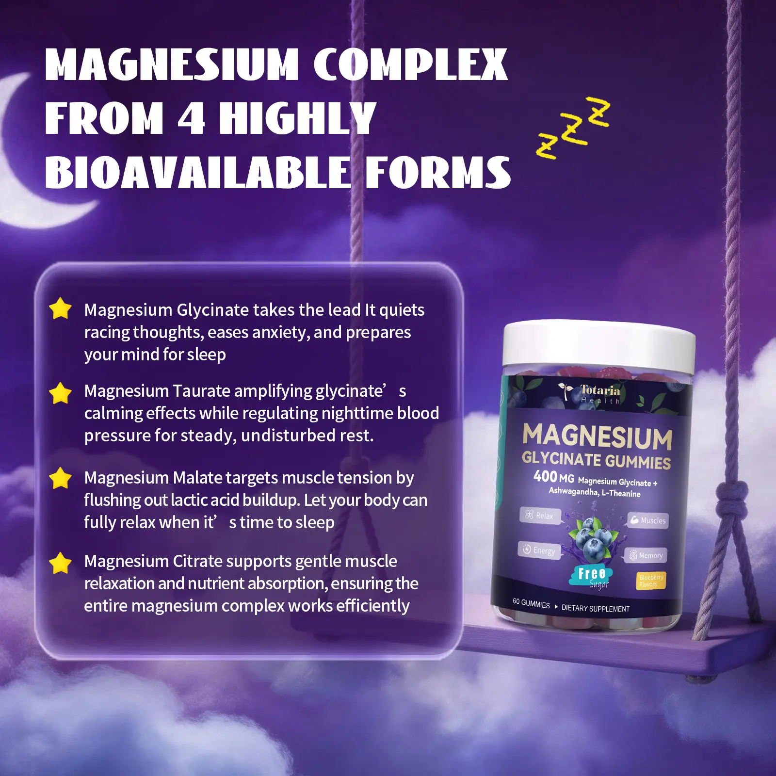 ·[Easier Sleep & Deep Relaxation Support] Formulated to help calm the mind and body before bedtime, this magnesium glycinate gummy combines Magnesium, Ashwagandha, L-Theanine, and Taurine to support relaxation, stress balance, and a more restful night’s sleep—ideal for those who struggle to fall asleep or stay asleep.
