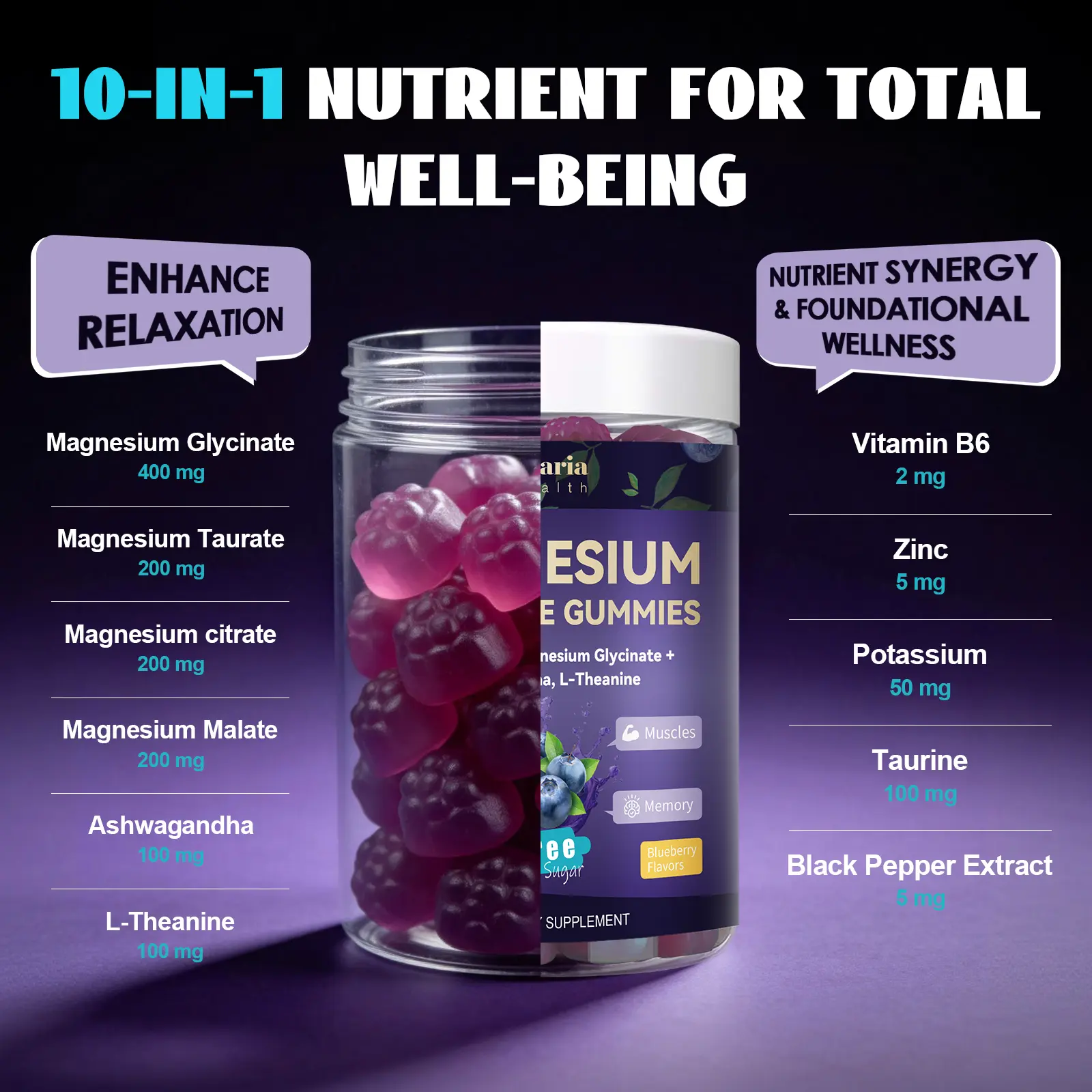 ·[Advanced High-Absorption Magnesium Complex] Powered by a 1000 mg Advanced Magnesium Complex from four highly bioavailable forms—Magnesium Glycinate, Malate, Taurate, and Citrate—to support muscle relaxation, nervous system health, and overall magnesium absorption without the digestive discomfort often associated with traditional magnesium supplements.