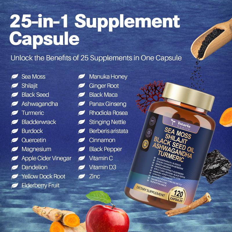 This comprehensive supplement includes 12 forms of magnesium, 25in1 sea moss, and a B complex with 13 essential vitamins. It's designed to support total body energy metabolism and stress relief. Perfect for anyone looking to enhance their health naturally.