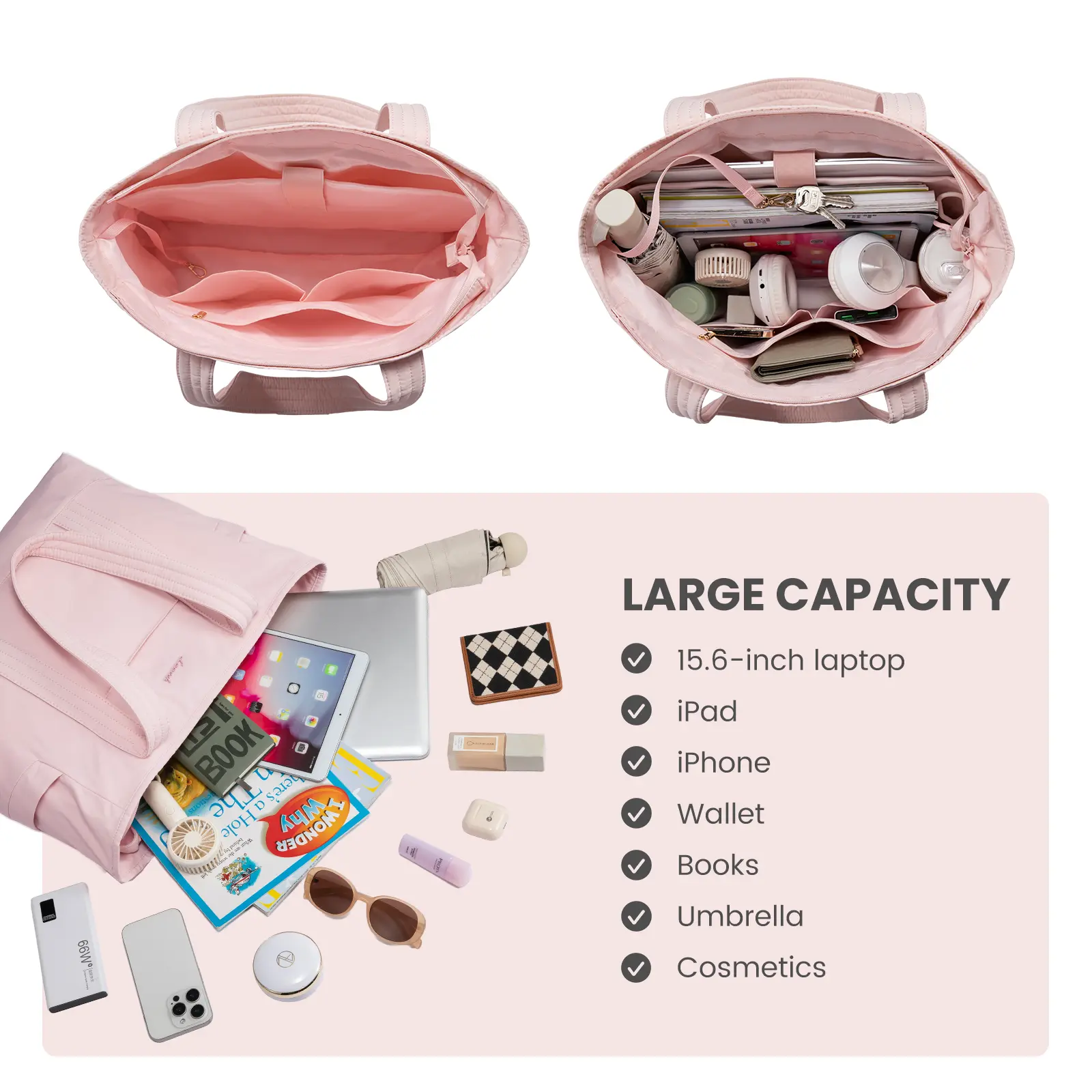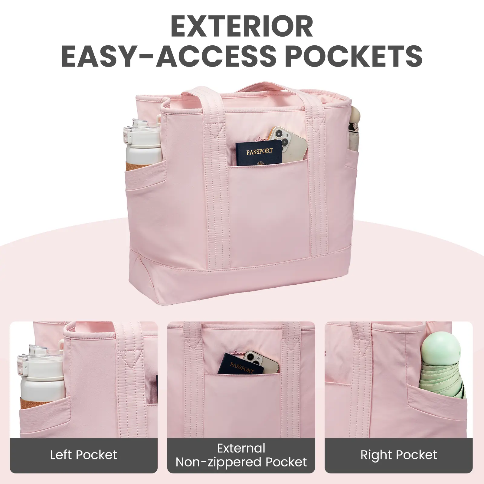 I just received my pink tote bag today I’m in love, Beautiful the color is perfect. 😍 I love all the spaces inside, I thought it brought an extra pouch inside to hold a small umbrella or a steel coffee mug holder. But still love it and it does have a lot of pockets inside.