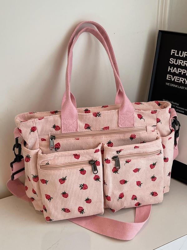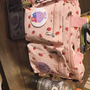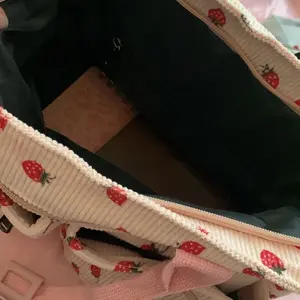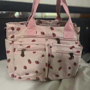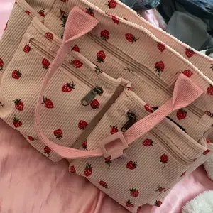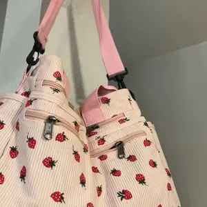 Berry cute but please note the inside is a water resistant lunch bag material, doesn’t bother me but does some. Strawberry print is slightly messy, looks better on the pink bag than the black bag. Very roomy lots of pockets. Good budget (mine was on sale for 13.58) can hold 2 20oz cups in front!
