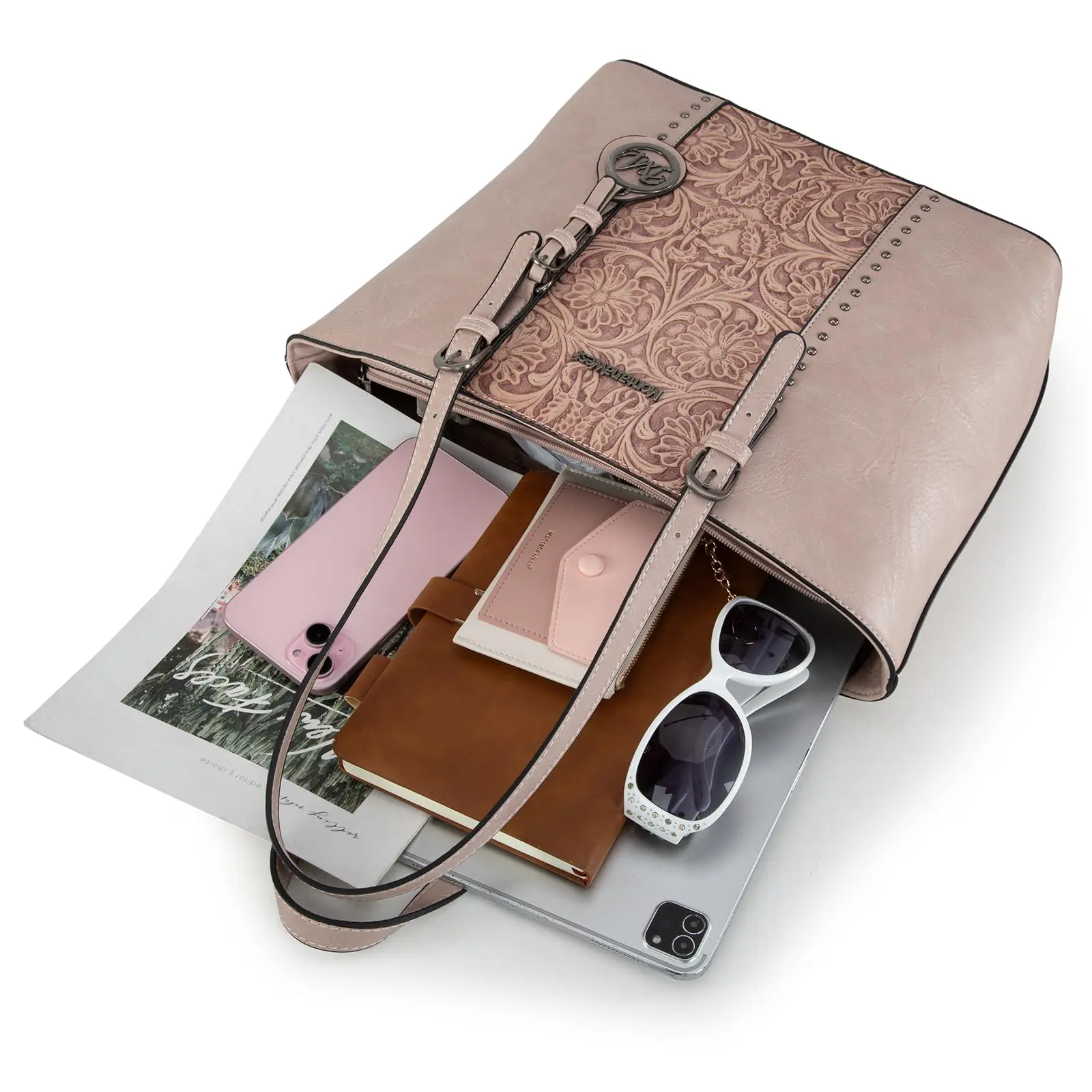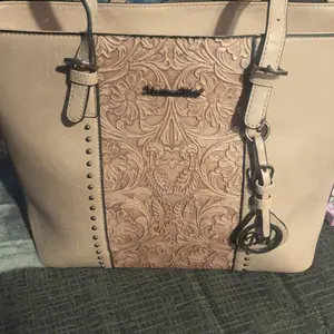 Large bag with lots of space inside the first purse the design has great detail on the front there’s also a zipper pocket inside and outside of it