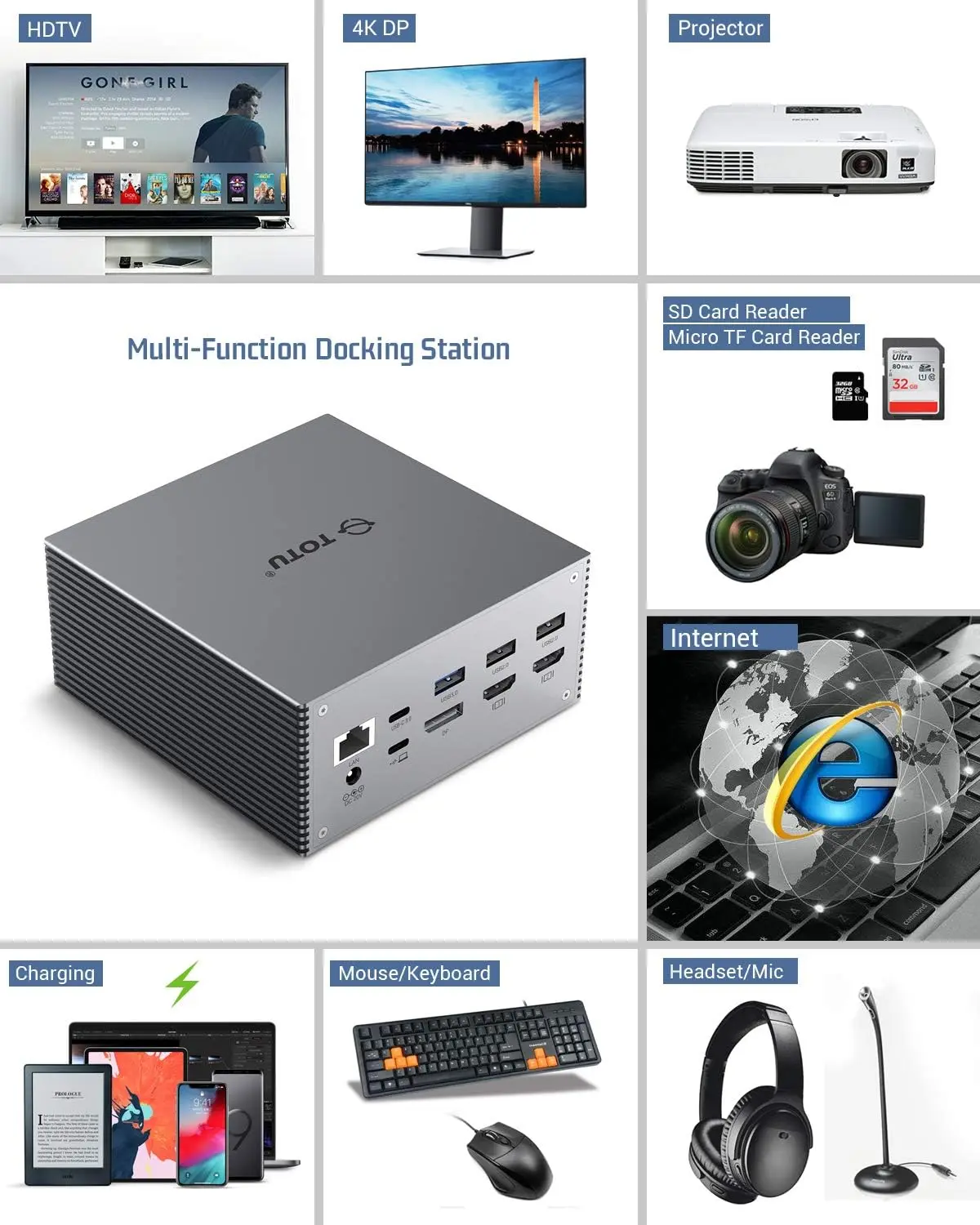 ·Easy Setup - Plug-and-play design enables you to have everything plugged in and docked with one plug. Simply plug in the TOTU docking station connect cable to charge your device and access external monitors & keyboard & mouse and more. Instantly transforms your laptop/tablet into a desktop PC and saves wire clutter on your desk. TOTU Dock is built to boost your productivity.