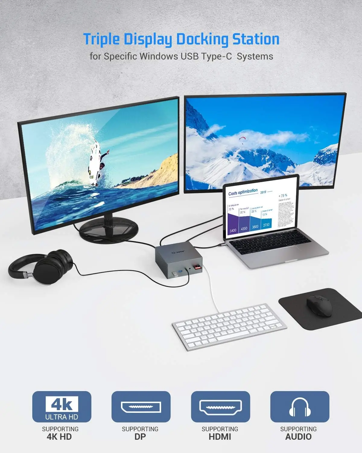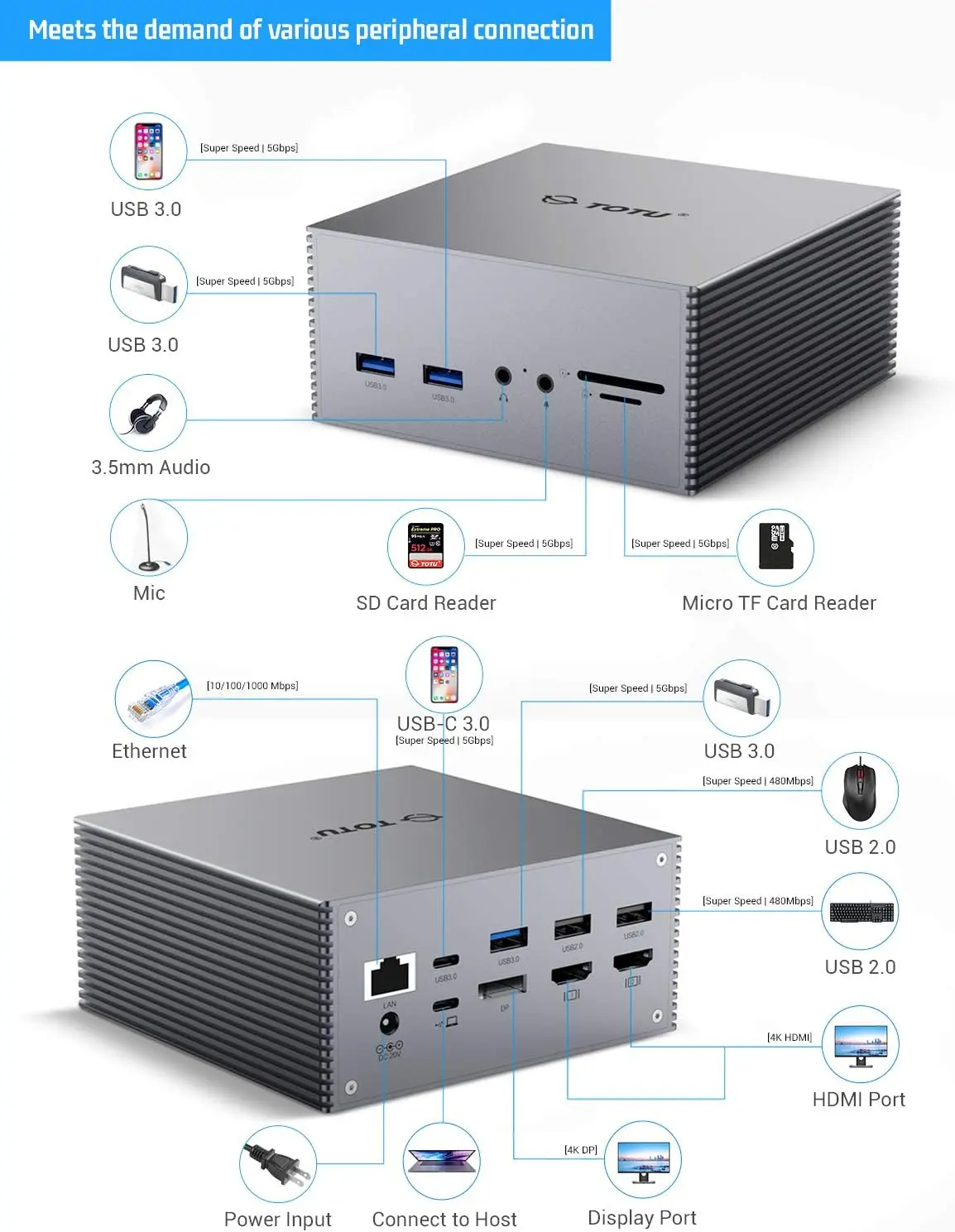 ·Ultimate Efficiency - Tons of Ports, including dual 4K HDMI, DisplayPort, Ethernet, 3 USB 3.0, 2 USB 2.0, USB-C 3.0 for USB-C device expanding and charging, SD&TF card reader, 3.5 mm Audio, Mic, 60W Power input for the docking station, USB-C port with power delivery to host with the equipped 3.3ft long USB-C to USB-C cable. Having everything available for a working and entertaining environment.