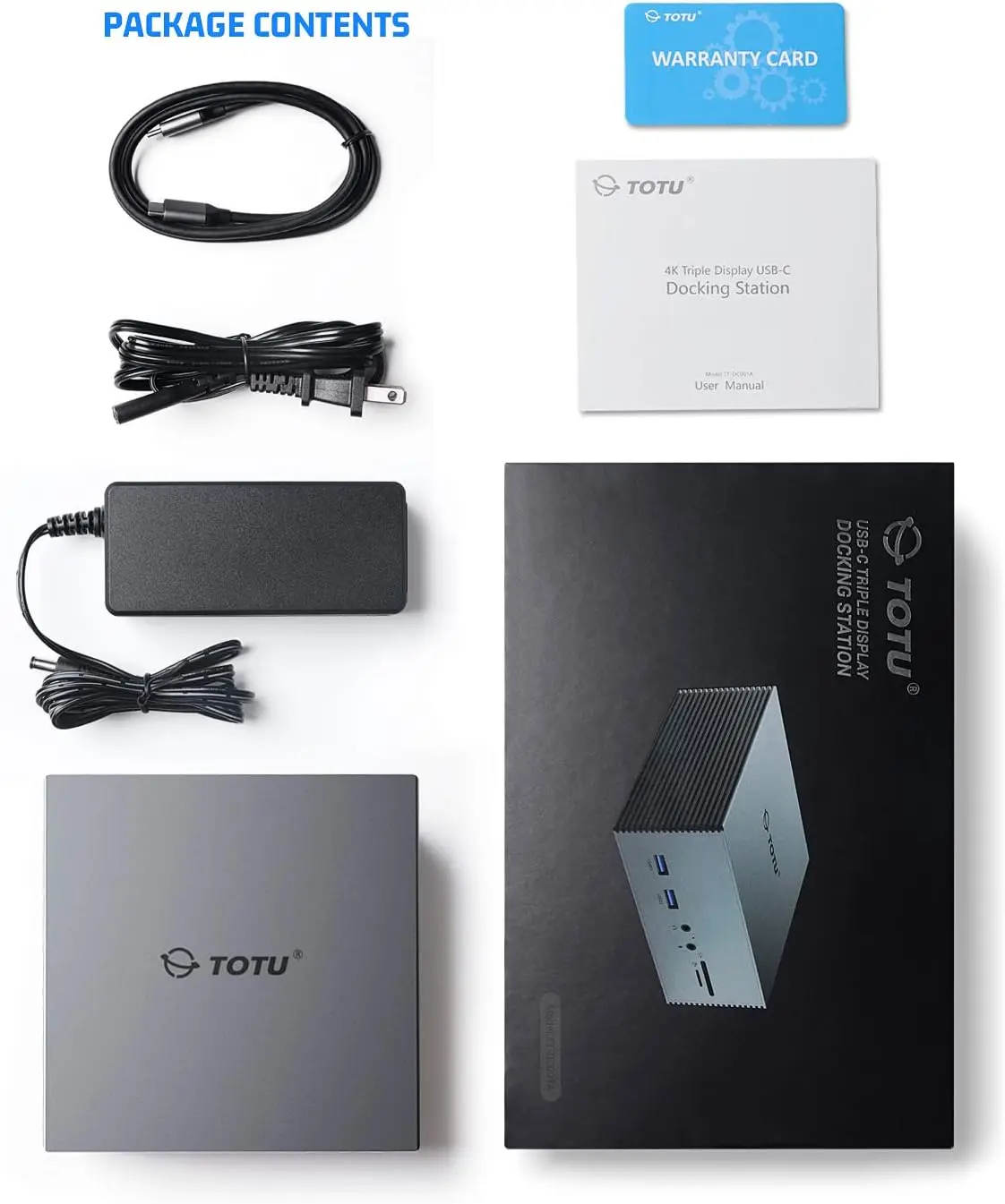 ·Package Includes - TOTU Triple Display Docking Station 60W(20V 3A)DC Power Adapter(power delivery enables you to power and charge a supported system without the need for a traditional proprietary OEM charger), USB-C to USB-C cable, user manual. TOTU offers 100% money back for quality problem within 30 days and a 12-month warranty if the product doesn’t meet your satisfaction.
