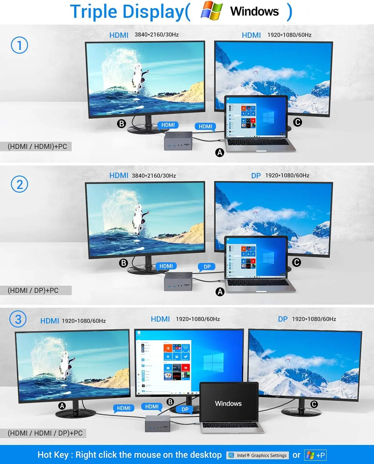 ·Two HDMI and a DP port for connecting three external monitors and support for resolutions up to 4K 30Hz.For better user experience, Please use HDMI2.0 or above.