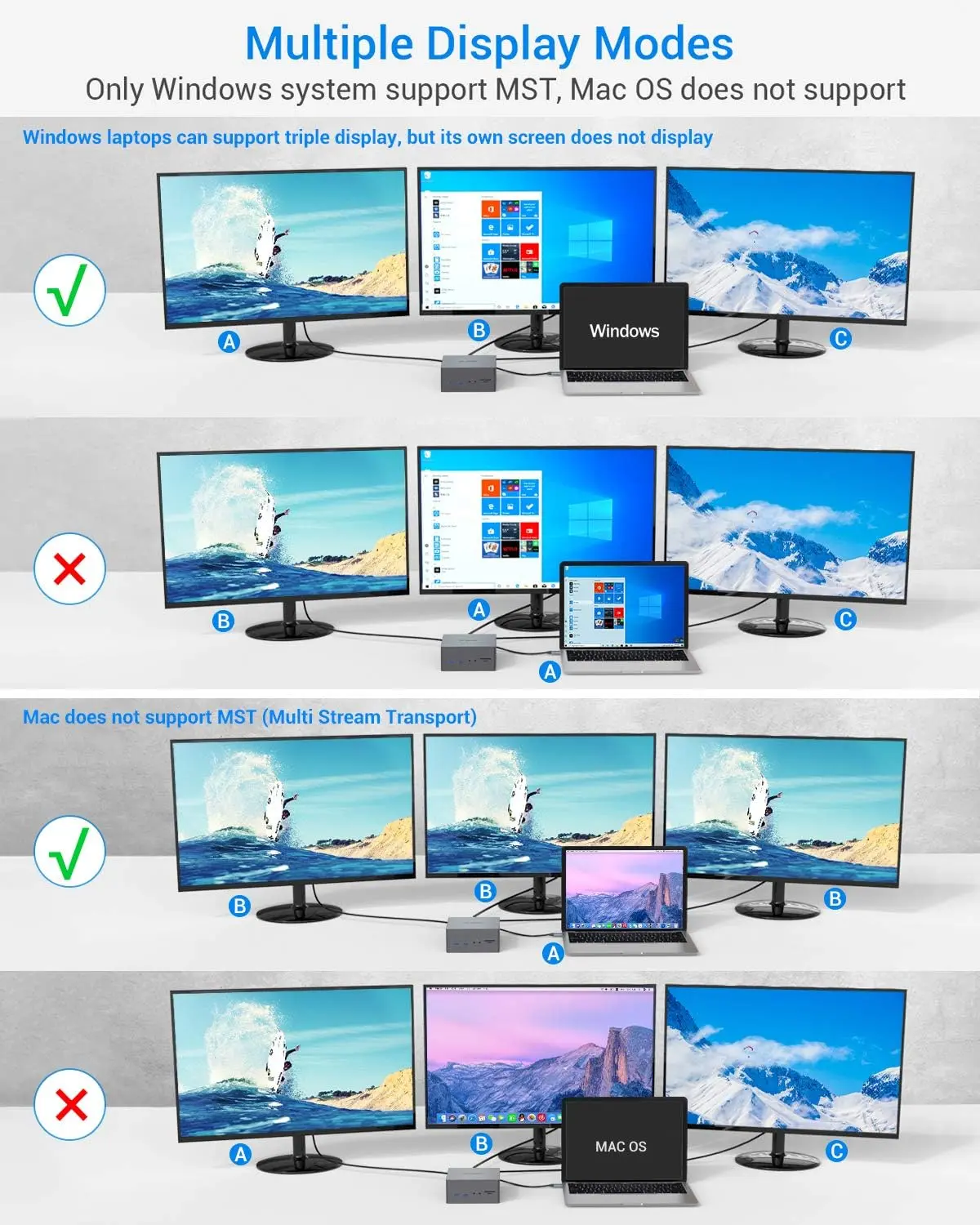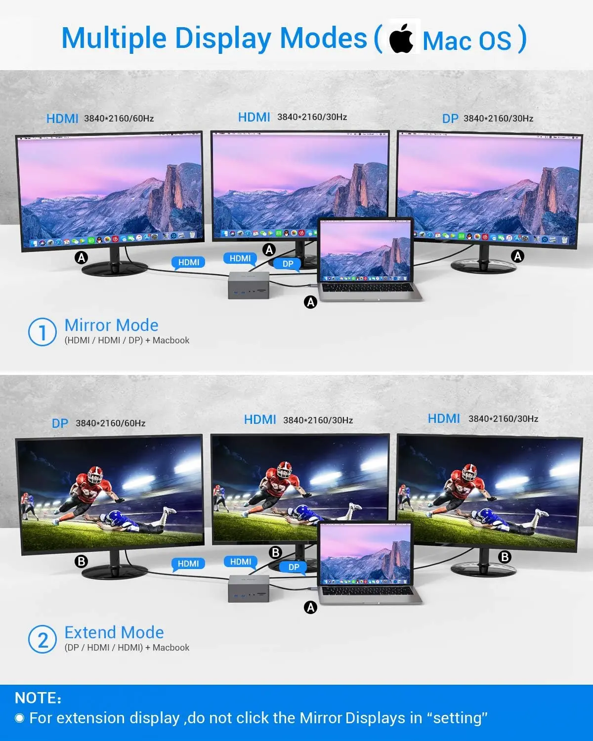 ·Triple Display Flexibility - Break through the limitations of a notebook PC by extending up to three external monitors simultaneously through dual HDMI, DP. Support single (HDMI/DP) monitor (HDMI+DP) up to 4K@30Hz, or triple monitor up to 1080P@60Hz. Note: Mac OS laptops will ONLY extend to ONE monitor. The others will be mirrored.