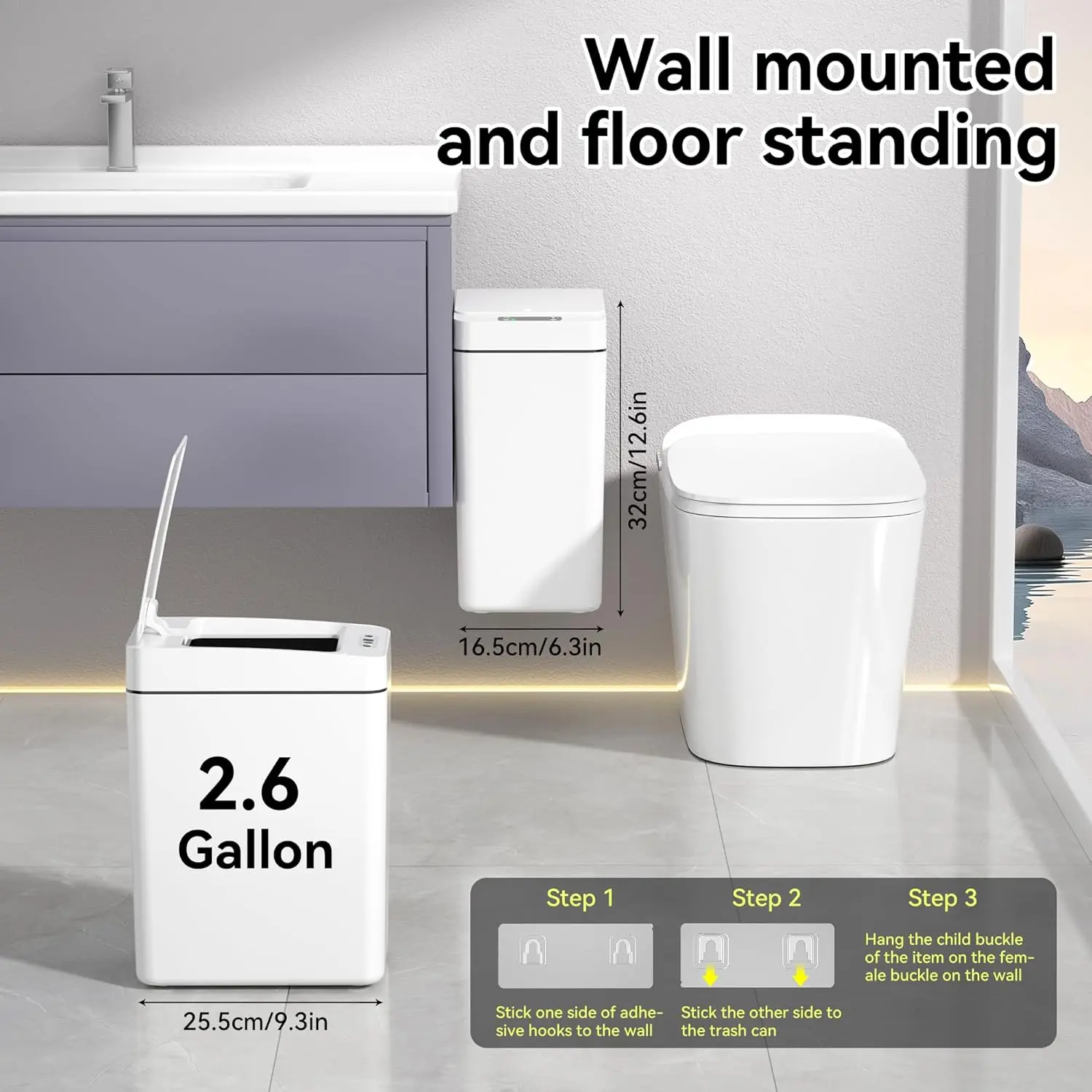 SPACE SAVING: 9.3 "L x 6.3 "W x 12.6 "H. The 2.6 gallon capacity automatic trash can has enough storage space. Rectangular design is suitable for bathrooms, kitchens, bedrooms, RVs, offices, or any tight places. Made of high quality ABS+PP material, the trash can can easily handle wet environments like bathrooms.