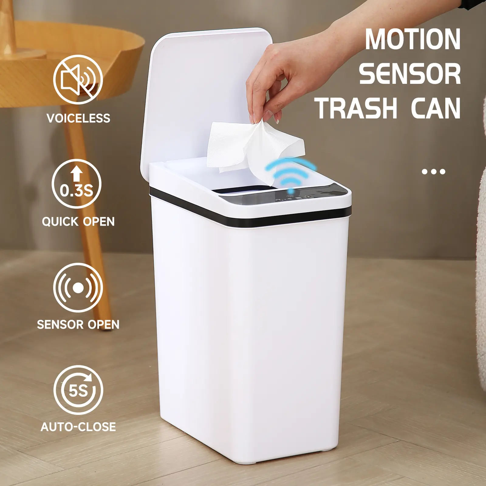 Compact Design: This small motion sensor smart trash can is perfect for small spaces.It holds 2.2 gallons and fits seamlessly into bedrooms, bathrooms, offices, or living rooms.The slim design ensures it doesn't take up much room.trash bin reduces contact with germs.Simply move your hand over the