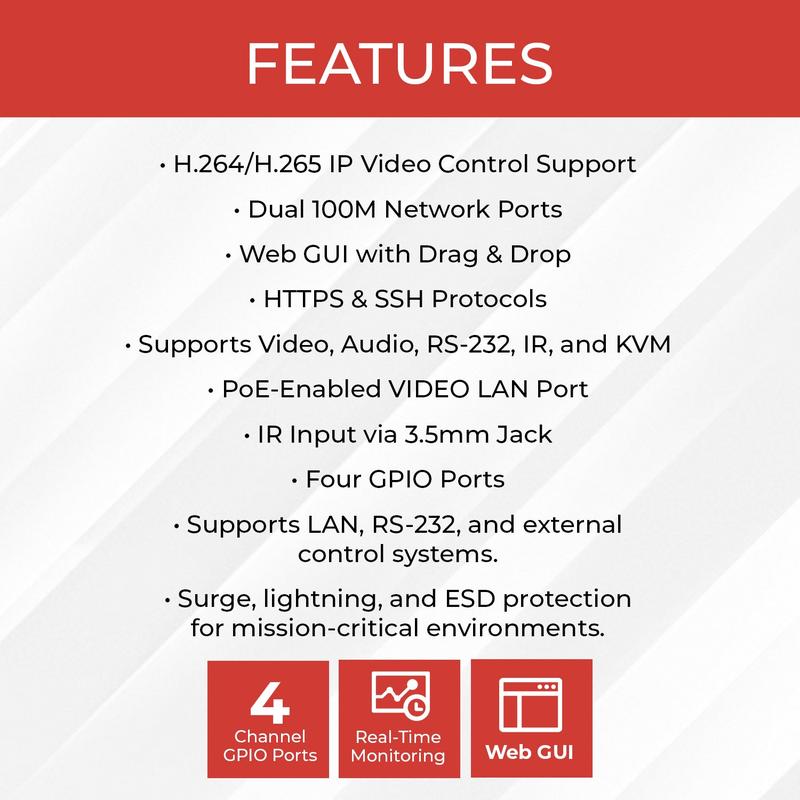 Additional functionality includes a PoE-supported VIDEO LAN port, a 12V-compatible IR input via 3.5mm jack, and four GPIO ports with selectable 5V or 12V output. It supports third-party control system integration and is protected against lightning, surges, and ESD—making it a reliable choice for 24/7 commercial or industrial operation.