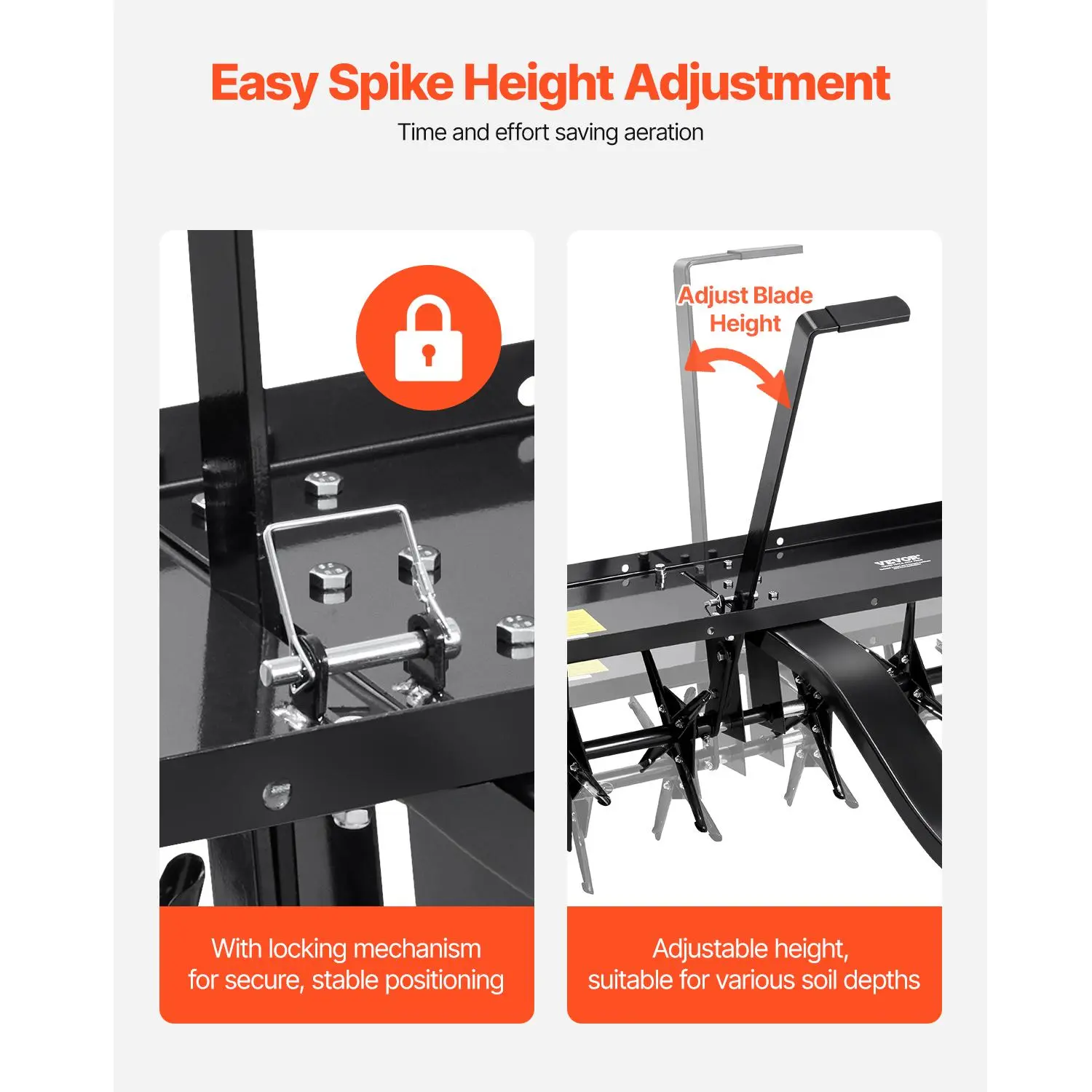 • Adjustable Height: You can adjust the tray height using the lawn aerator’s lift handle to achieve the ideal penetration depth or suit different soil heights. The locking mechanism ensures the position stays secure, avoiding any accidental detachment or loosening during use.