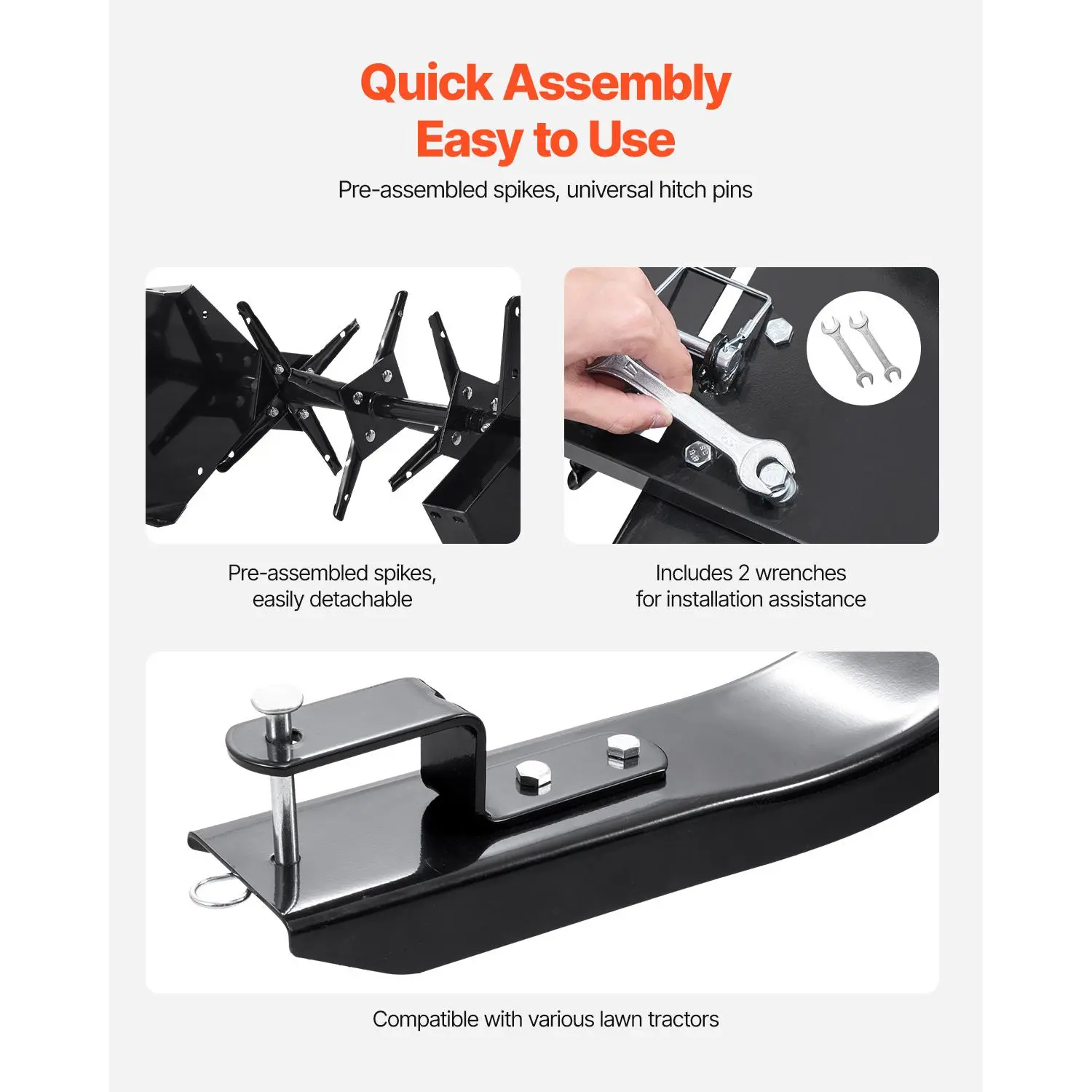 • Quick Installation: Our lawn aerator tow behind comes with pre-installed spikes and includes 2 wrenches for easy setup. You can start using it right away upon delivery. The package also includes a detailed manual for clear instructions and security tips.