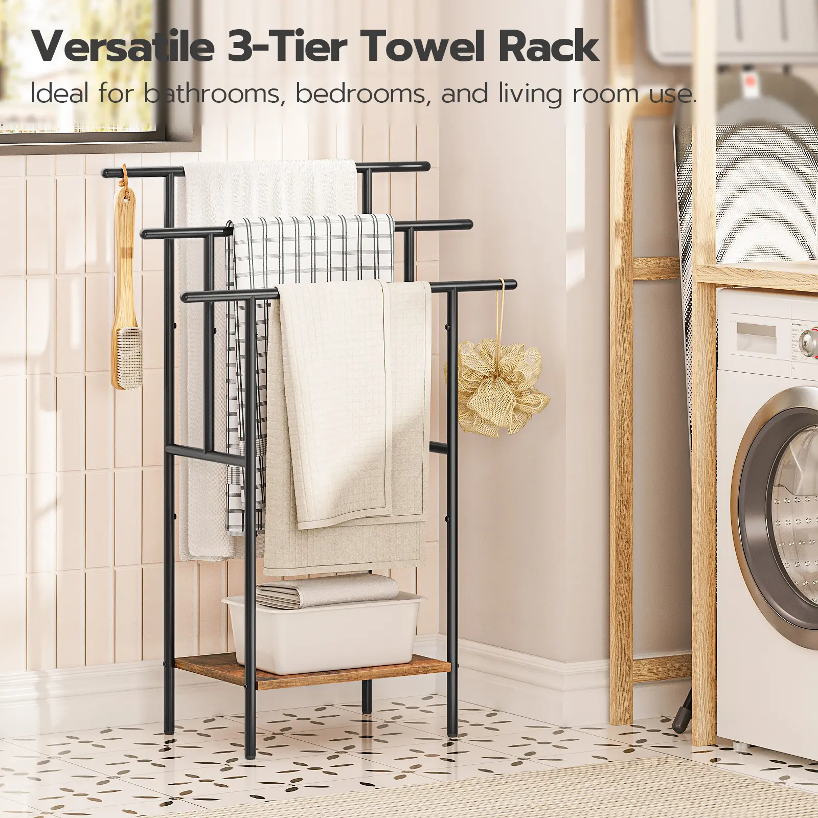 To enhance the applicability of the towel rack, we have designed 3 horizontal bars with heights of 31.5", 35.4" and 39.4" from the ground.