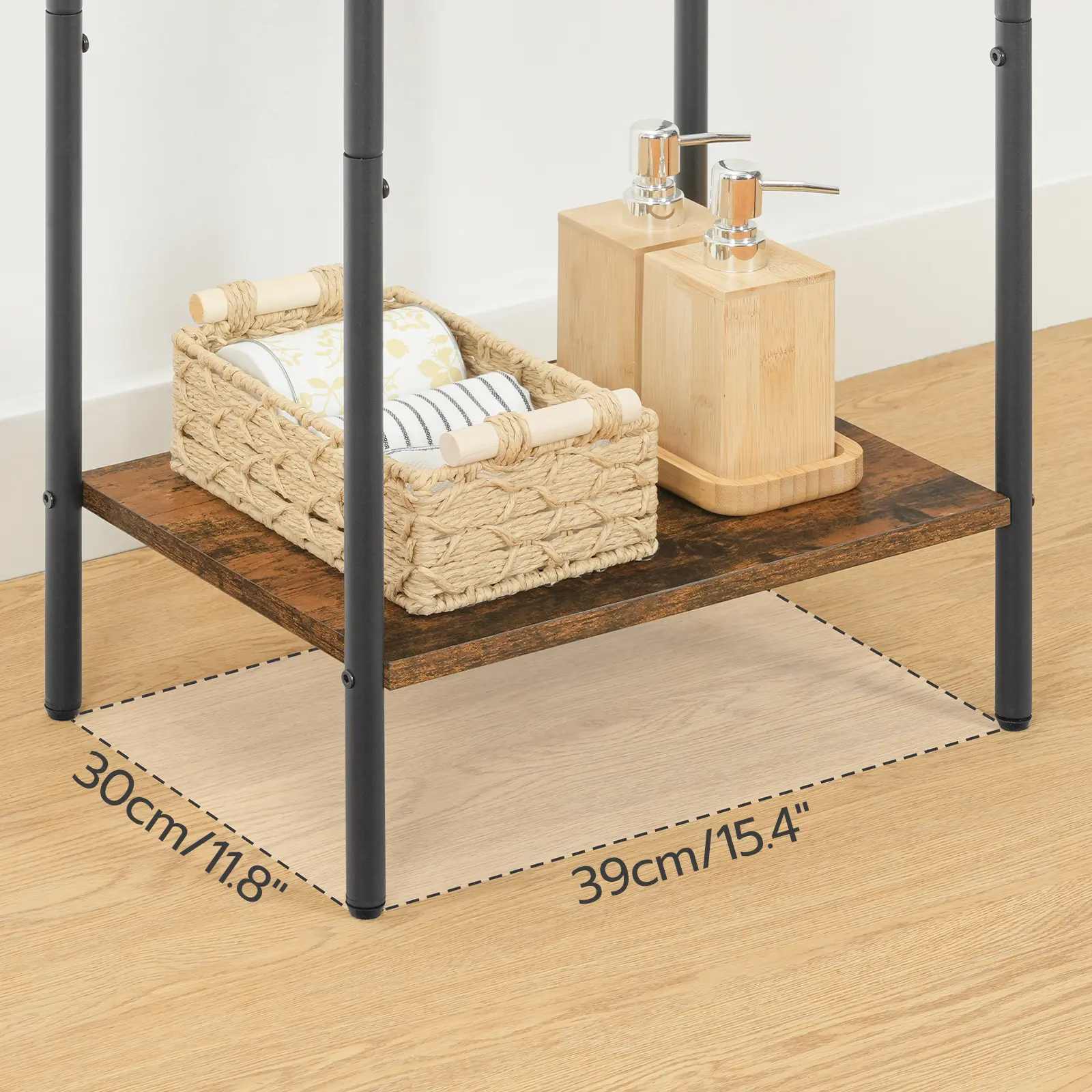 This firm towel rack uses metal tubes with a diameter of 20mm for its bars and frame and 15mm thick panel as the open shelf.