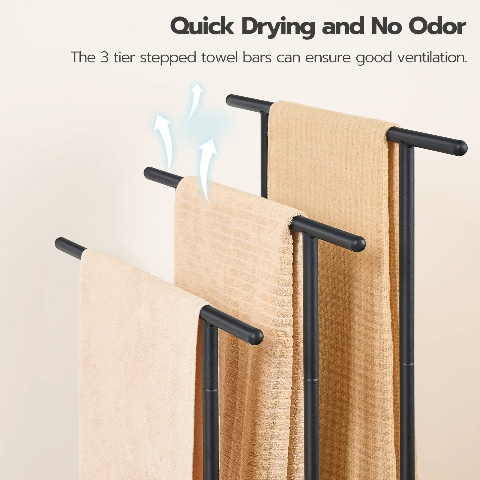 The stepped bars of the quilt rack are spaced 4.7" apart to maintain ventilation, accelerate drying and protect towels from odors.