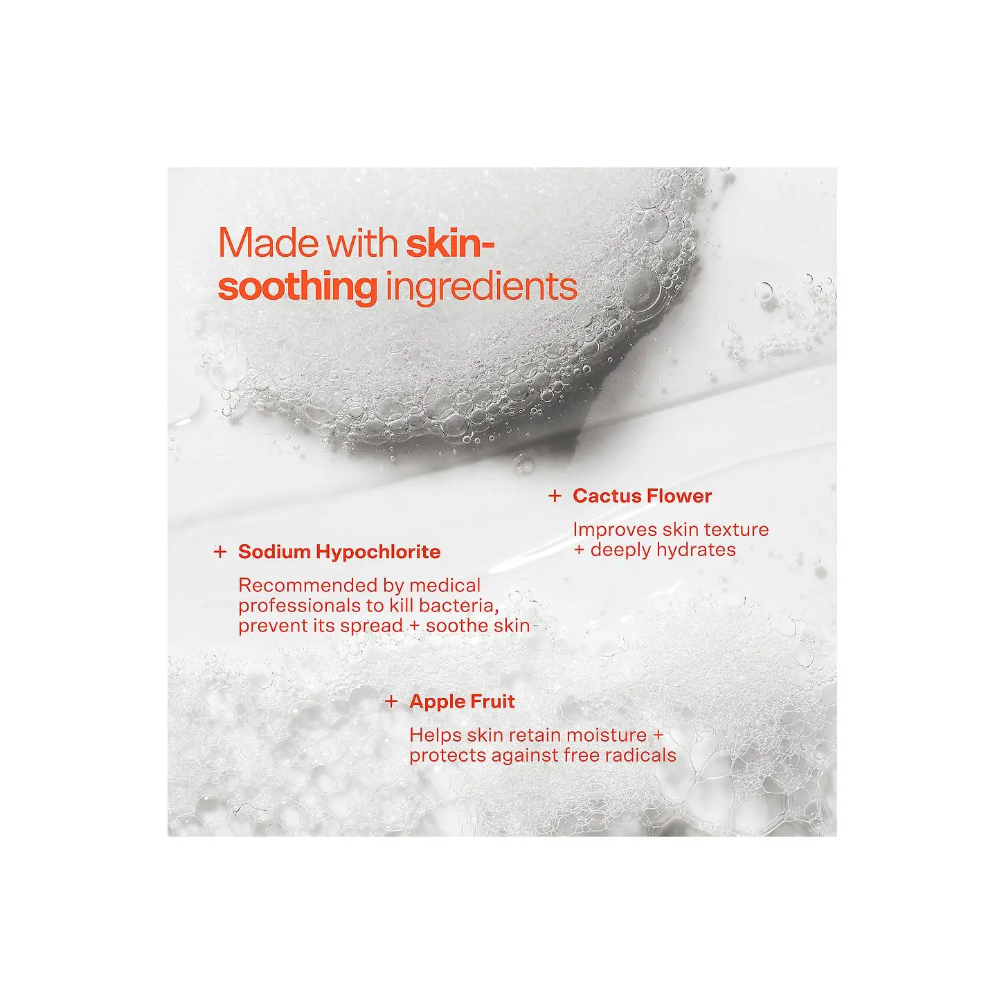 ·ingredients: Water/Aqua/Eau, Cocamidopropyl Hydroxysultaine, Glycerin, Sodium Cocoyl Glutamate, Citric Acid, Sodium Chloride, Butylene Glycol, Cereus Grandiflorus (Cactus) Flower Extract, Pyrus Malus (Apple) Fruit Extract, Sodium Hypochlorite (Hypochlorous Acid, Sodium Salt), Tetrasodium Glutamate Diacetate*Disclaimer: Ingredients are subject to change at the manufacturer's discretion. For the most complete and up-to-date list of ingredients, refer to the product packaging.