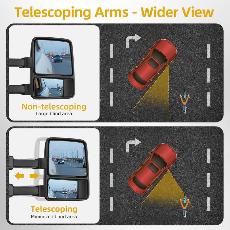 Functions: featuring power adjustable & power heated plane mirror, manually adjustable convex lens, amber turn signal indicators, manual telescoping & folding, the multifunctional side mirrors can strikingly enhance your driving experience