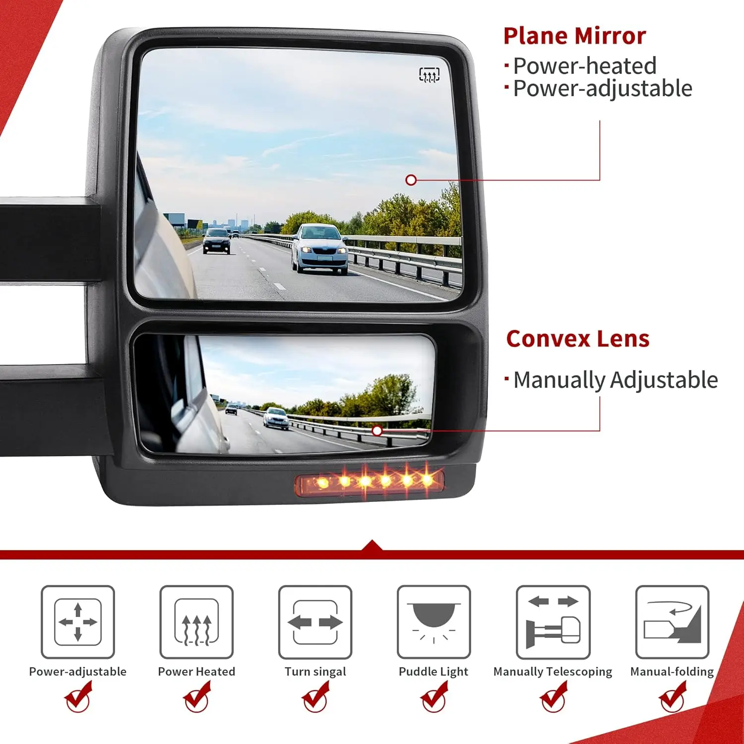 Ā·Power Heated: Equipped with a power heated feature for enhanced visibility during towing.