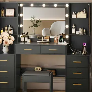 ·【Vanity Table with Charging Station】The vanity features a charging station above the tabletop, including 2 standard plug sockets and 2 USB ports. You can easily use hair dryer, curling iron in front the mirror, and charge your phone during makeup.