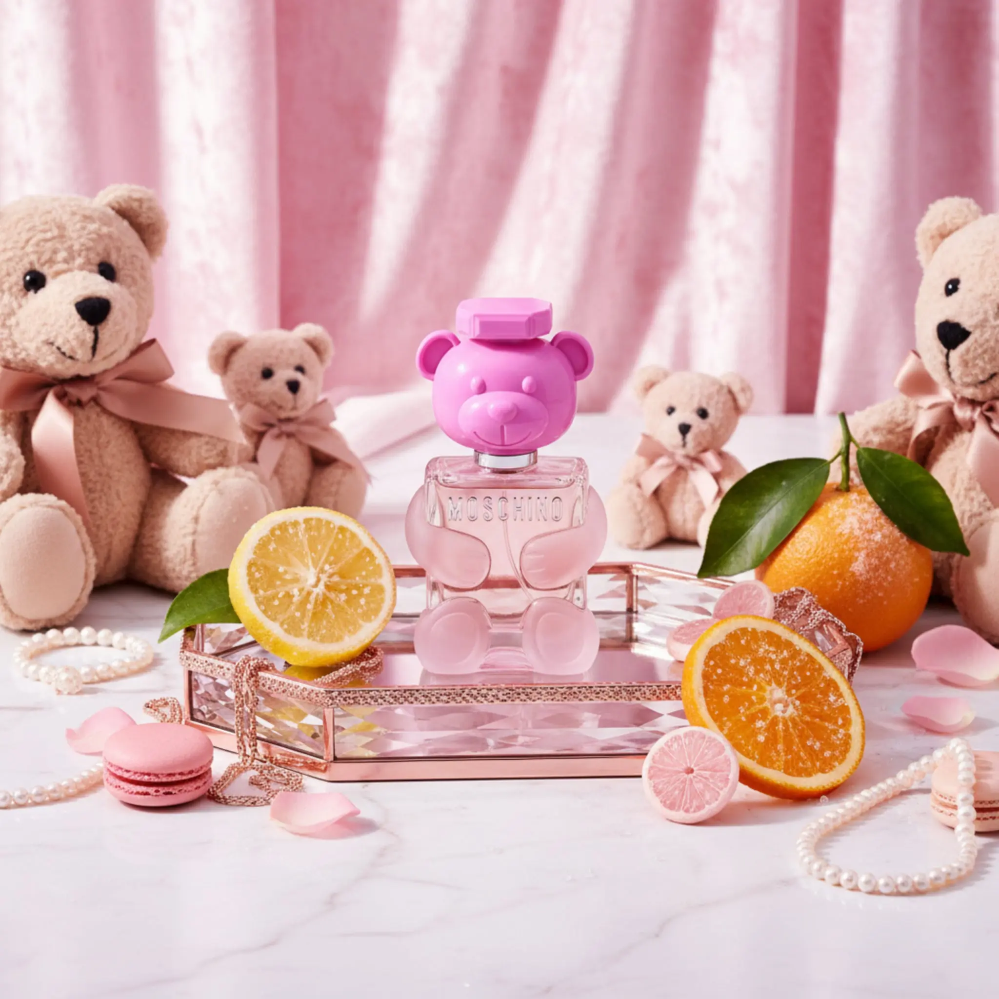 Step into a playful world of candy-coloured fun with Toy 2 Bubble Gum by Moschino — a cheeky, vibrant fragrance that captures the spirit of youthful indulgence and sweet nostalgia. Encased in the iconic teddy-bear bottle, this scent celebrates the joy of colour, flavour and creativity, blending candied citrus with bubble-gum notes and a warm woody-musky trail.