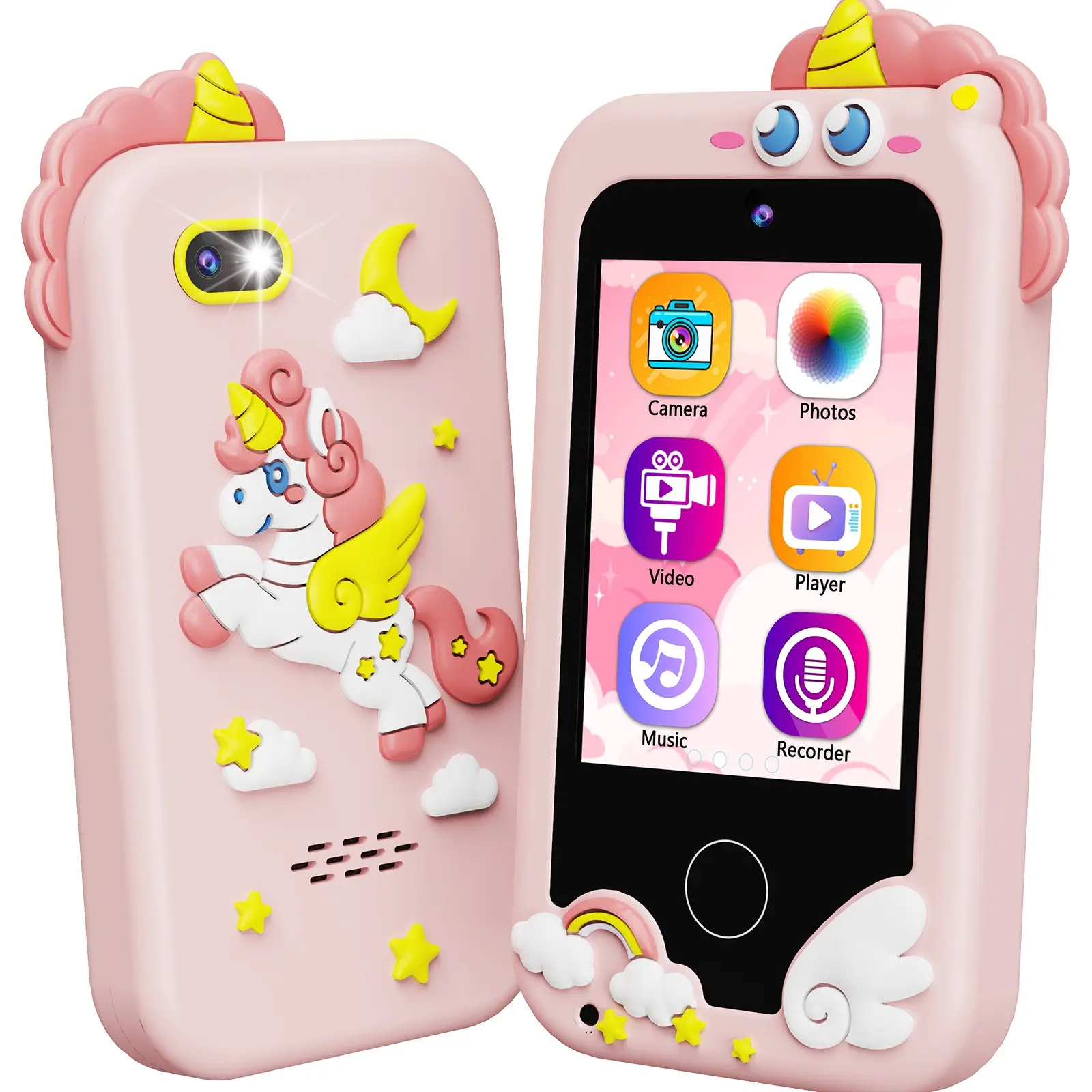 Smartphone Toy with Dual Camera: Explore tons of fun with this toy phone! Featuring a 2.8" IPS touchscreen and multiple functions such as camera, photos, video, music, calculator, calendar, torch, stopwatch, ABC learning, games, 26 mobile screensavers, and 11 wallpapers, it can be used as an MP3 player, camera, music player, game player, alarm clock, and calendar. This versatile toy offers both play and learning opportunities.
