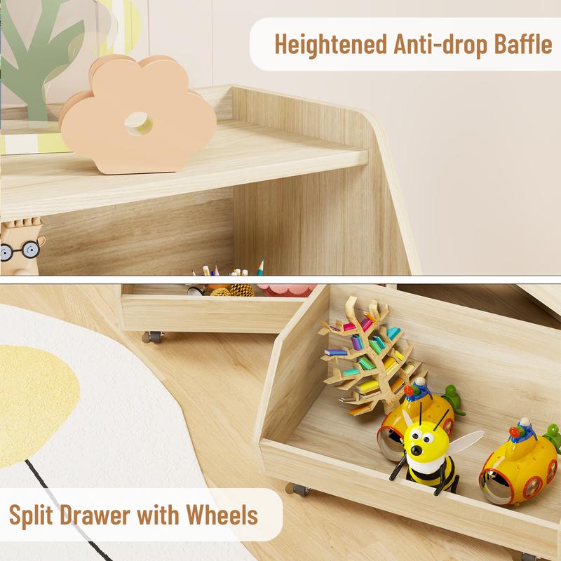 Our bookshelf for kids features 3-tier display shelves for books, toys, and ornaments; five sling pockets for easy storage of kids books. While one drawer with rolling wheels can be easily moved to different areas .