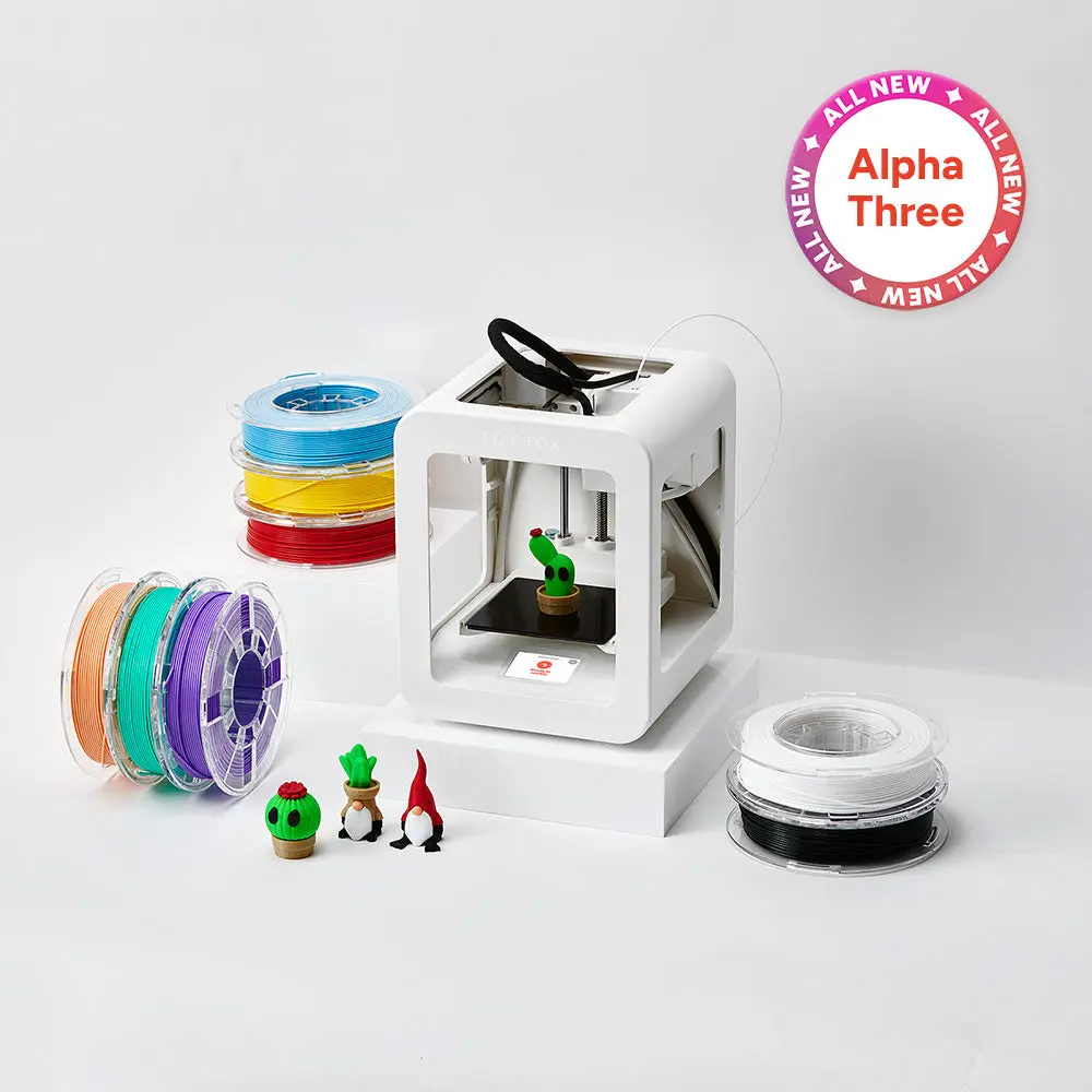 Toybox Alpha Three is the latest version of the first one-touch 3D printer for kids, designed to make toy-making even more fun! Alpha Three’s upgraded hardware delivers up to 2x faster prints and 1.5x finer print details, turning your ideas into reality faster than ever.