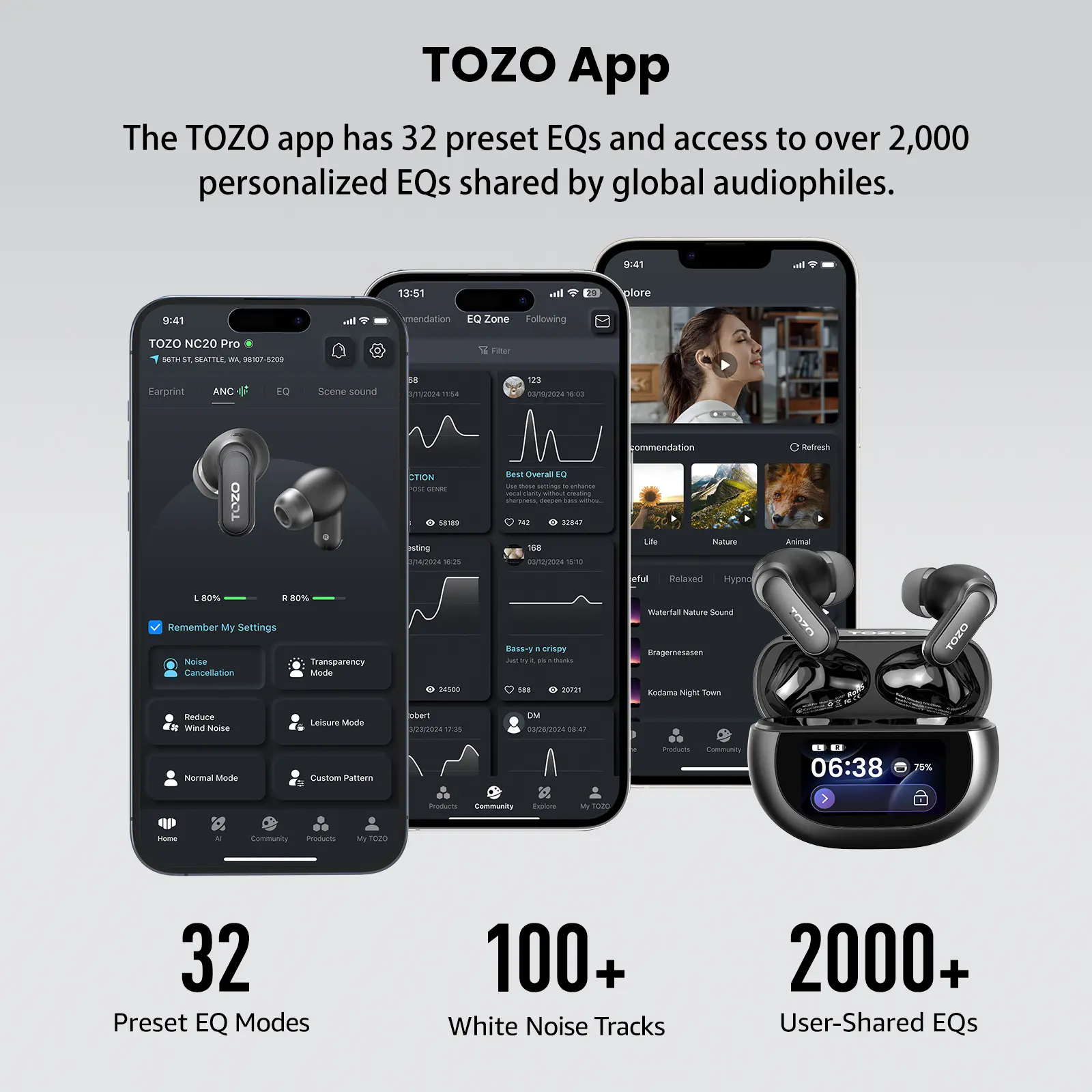 TOZO App Ecosystem: Use the app to access an AI voice assistant, customize touch controls, and choose from 32 preset EQ modes to match your music style.