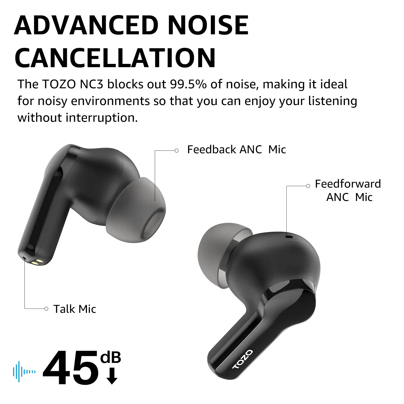 The TOZO NC3 features an ergonomic design that ensures a comfortable fit for all-day wear.