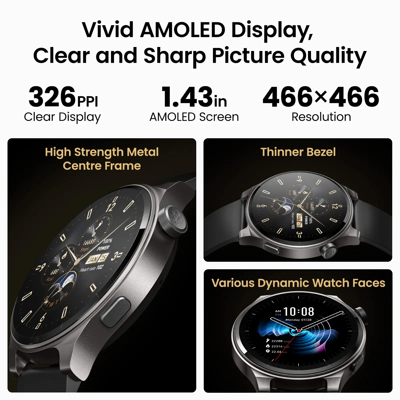 Dive into a stunning visual experience with a 1.43" AMOLED display featuring 326 PPl and a resolution of 466*466. The slim bezel enhances the screen space, providing a captivating viewing experience.