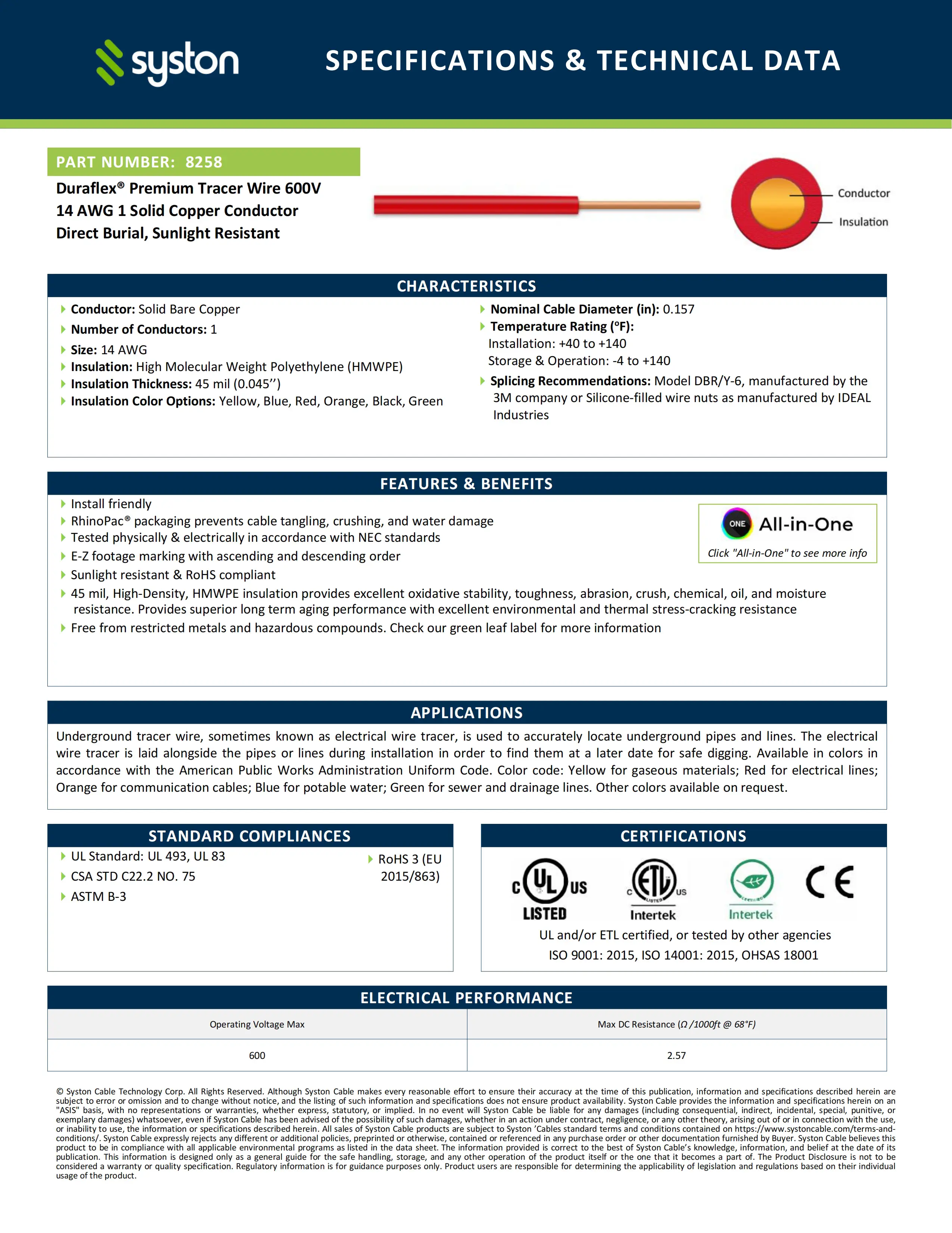 The SYSTON 14 AWG Tracer Wire is a direct burial wire for locating underground pipes, gas lines, water copper pipes, and fiber optic cables. It features a solid copper wire conductor and durable HMWPE insulation. This underground wire tracer ensures long-lasting performance in harsh environments. Perfect for pipe locator underground applications, including natural gas lines, water/sewer pipes, and irrigation wire systems.
