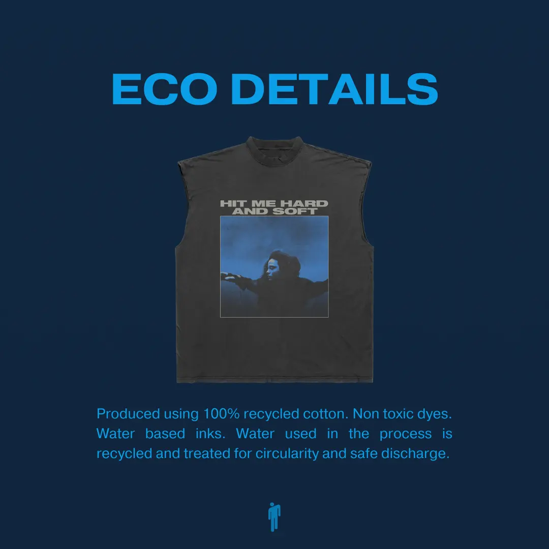Produced using 100% recycled cotton  Non toxic dyes Water based inks Water used in the process is recycled and treated for circularity and safe discharge