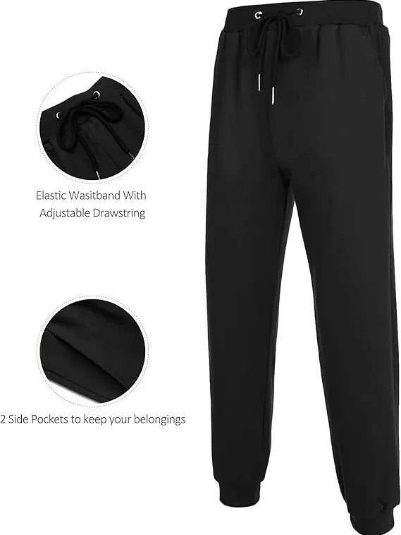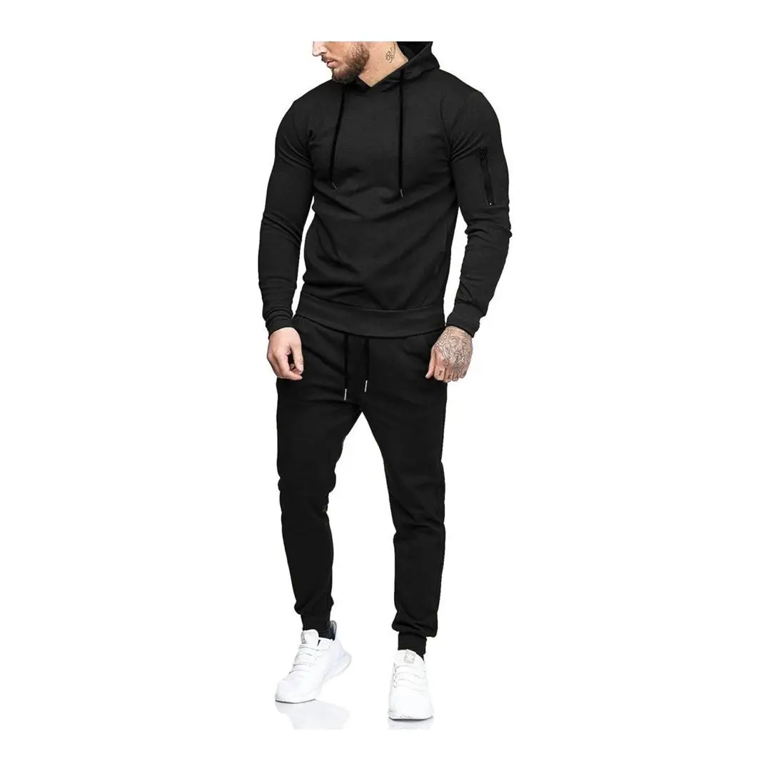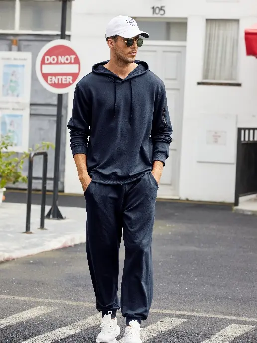 ·FEATURES: Mens 2 piece athletic tracksuits:long sleeve pullover hoodie sweatshirt with 2 side pockets,drawstrings,ribbed hem and cuffs and a zippered pocket on left arm; Pants with full length, 2 side pockets, gathered ribbed ankle, elastic waist design with a drawstring to maintain high performance in sports.