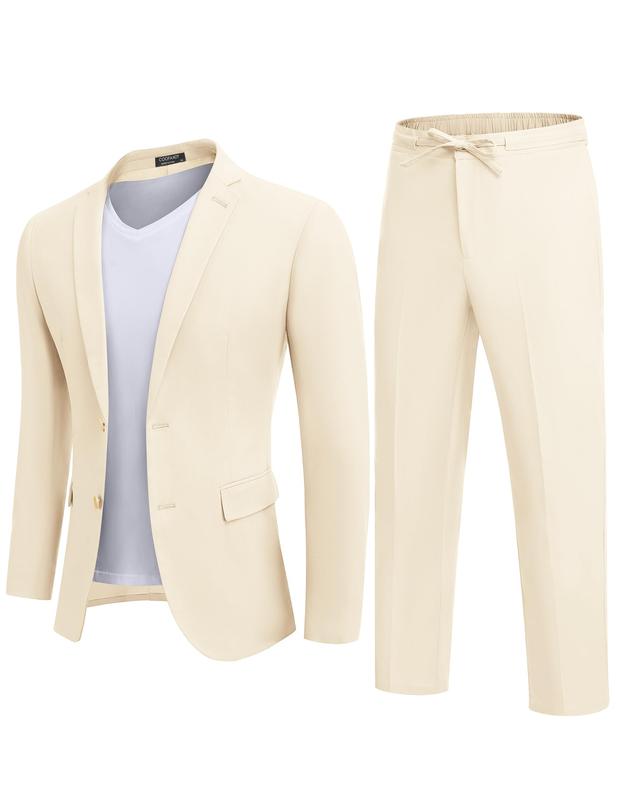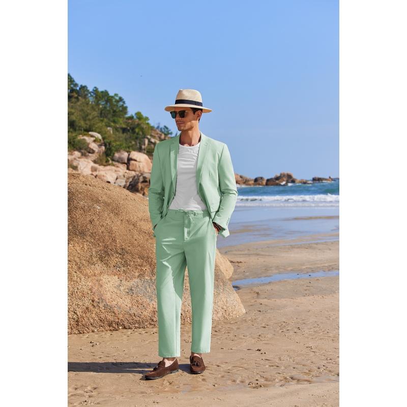 Β·γ2 Piece Linen Suit Setγ: 2 button blazer with 2 flap pockets, 1 double welt pocket on one side and 1 inner pocket. Regular fit, notch lapel, four button cuffs, center back slit. Flat front casual pants with elastic waist, zip fly, button end and adjustable drawstring, straight fit, 2 side pockets and 2 back button pockets. Mens suit jacket and trousers, classic and fashionable. Create an elegant and handsome style for you.