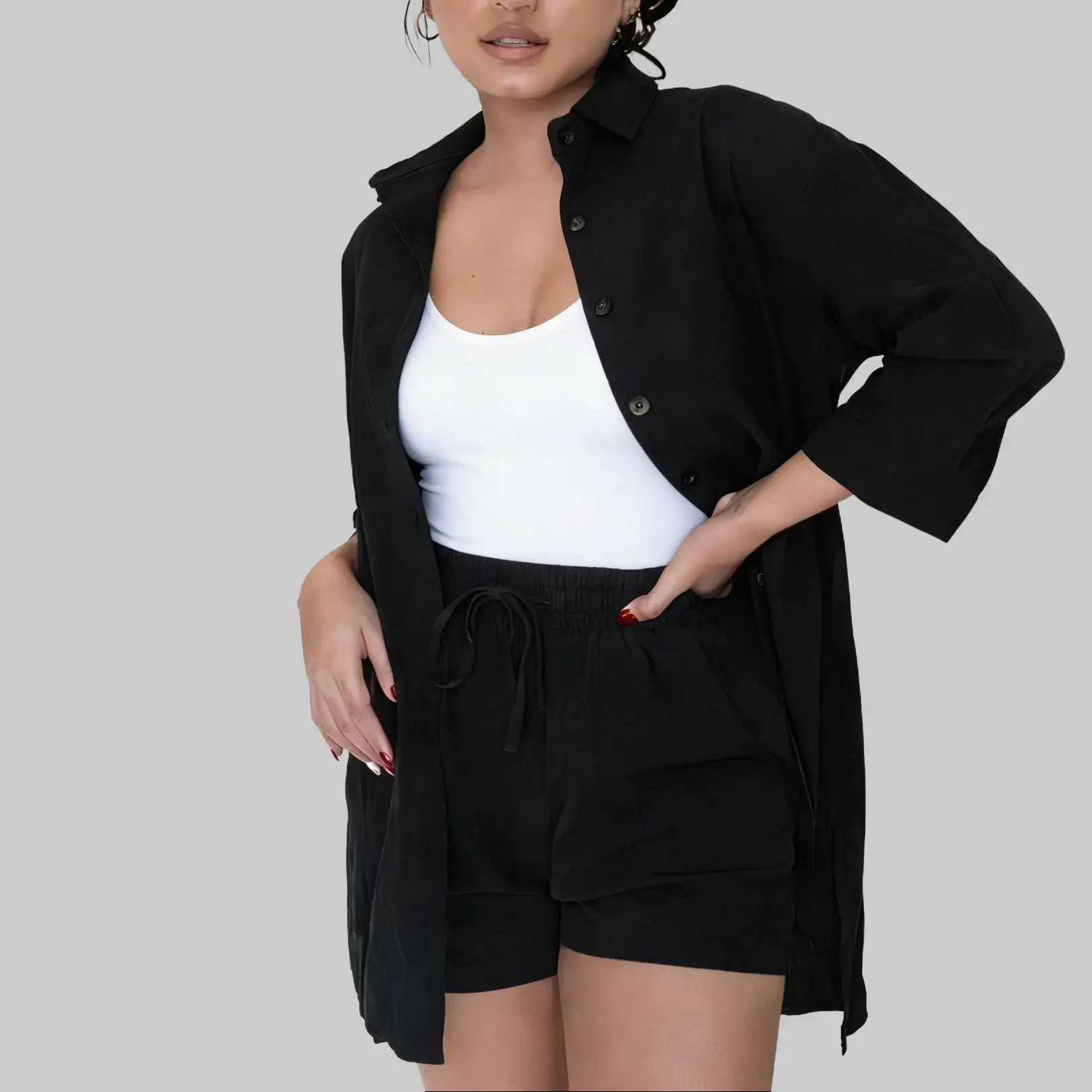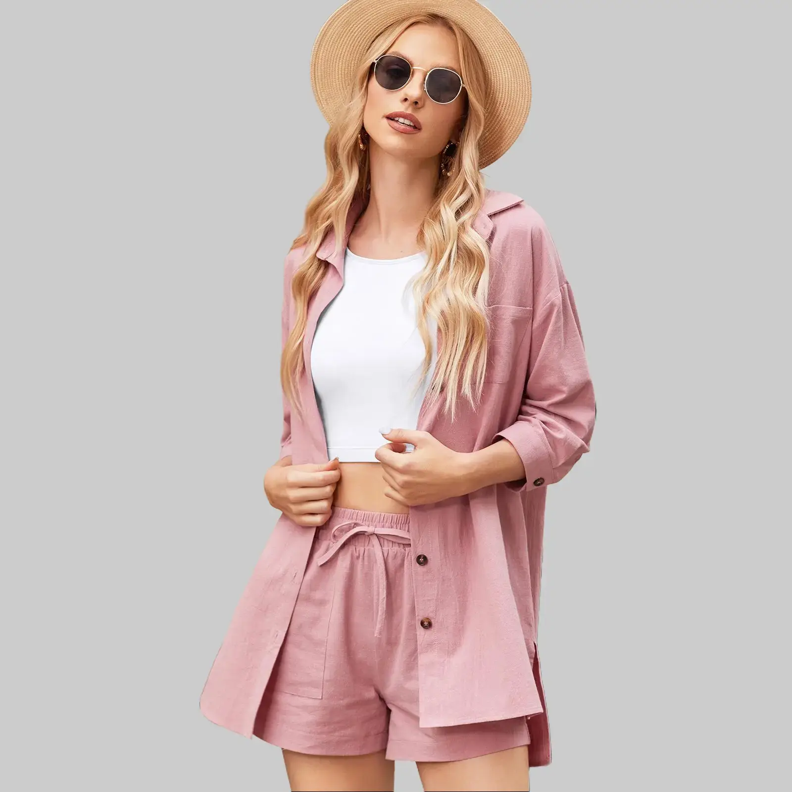 So cute for the beach and can be worn a bunch I different ways (shown in the pictures). 5'9" 135lbs and I got a medium. The shorts are the perfect size and the shirt is so big and long you could wear it alone as a beach cover up dress. The fabric is like a thick linen type material.