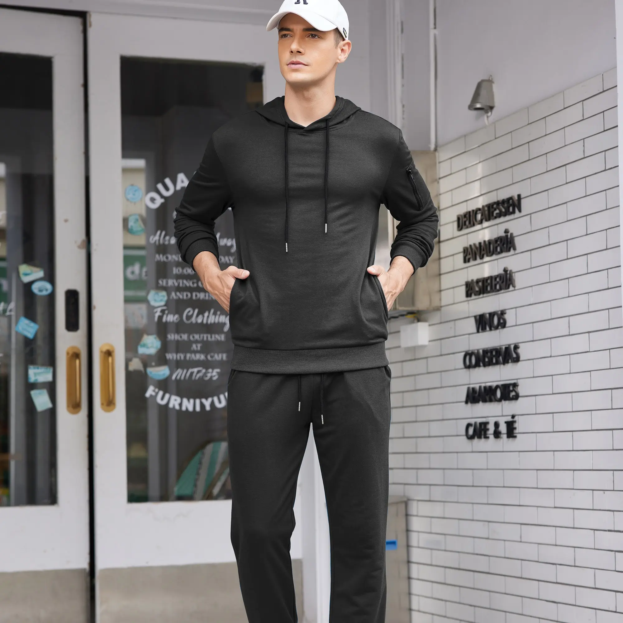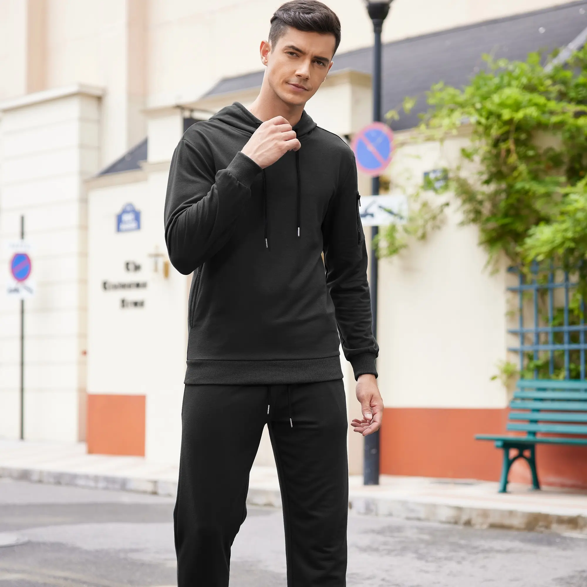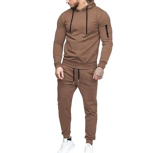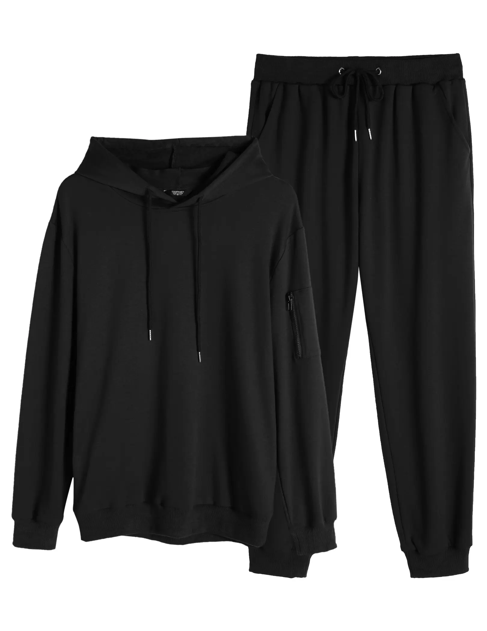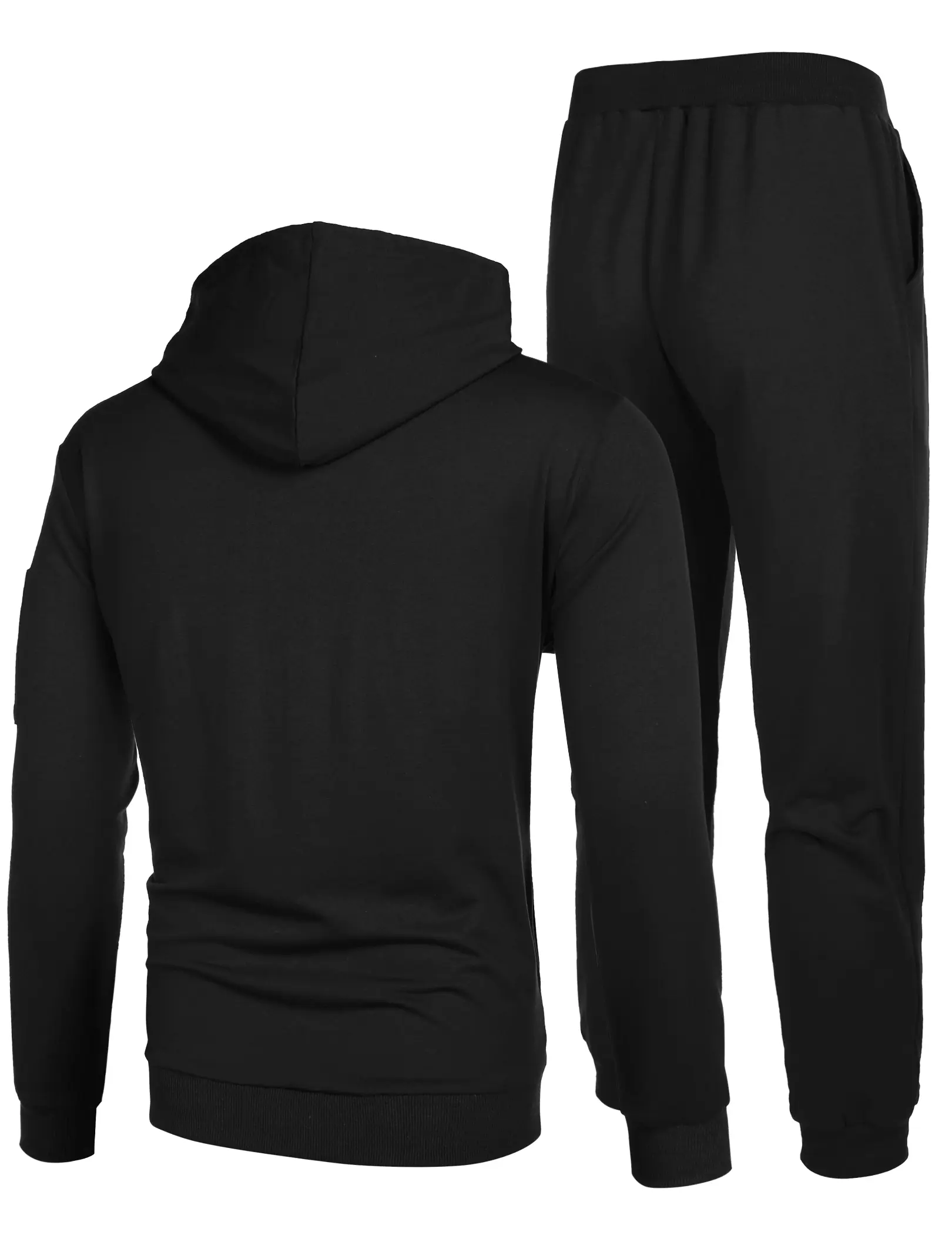 ·FEATURES: Mens 2 piece athletic tracksuits:long sleeve pullover hoodie sweatshirt with 2 side pockets,drawstrings,ribbed hem and cuffs and a zippered pocket on left arm;Pants with full length, 2 side pockets,gathered ribbed ankle,elastic waist design with a drawstring to maintain high performance in sports.