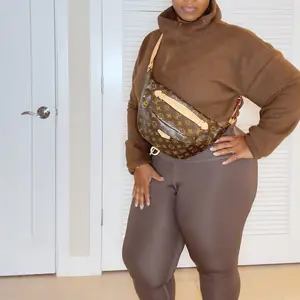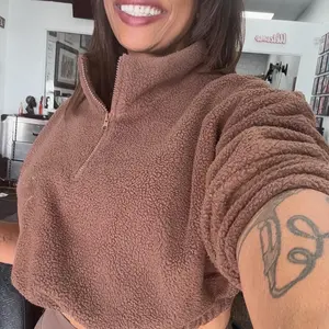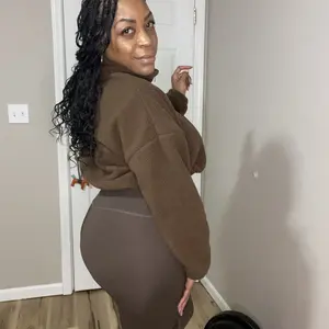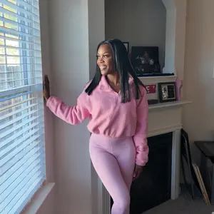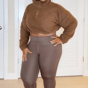 This outfit is cozy, cute, and comfortable. The fleece cropped sweater feels warm, while the matching sports bra and high-waisted leggings fit smoothly and flatter the body. The earthy brown color pulls the whole look together, making it perfect for lounging or running errands.