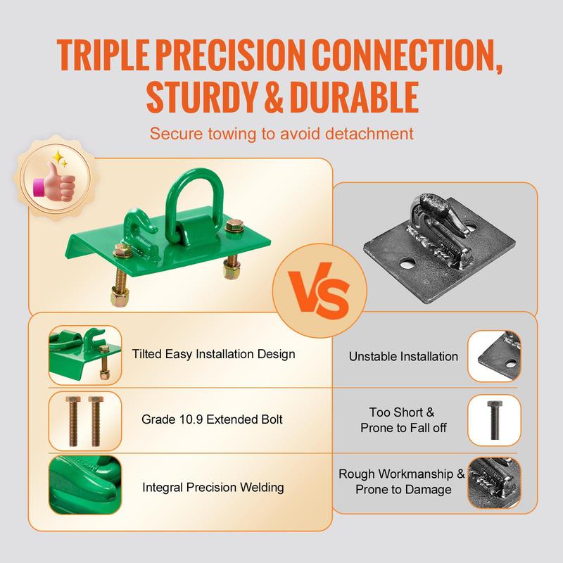 • Durable & Reliable: The tractor hooks feature precise structural connections and is securely fixed with a dual-thick base to ensure stability during towing operations. The surface is coated with green powder for enhanced protection, making it rust-resistant and capable of withstanding harsh weather conditions, thus extending its lifespan and ensuring long-term reliability.