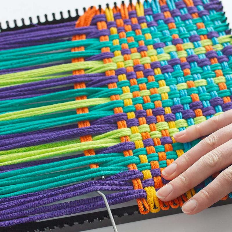 The loom is constructed with a metal frame and tongs are slanted slightly outward (to prevent the loops from slipping off).