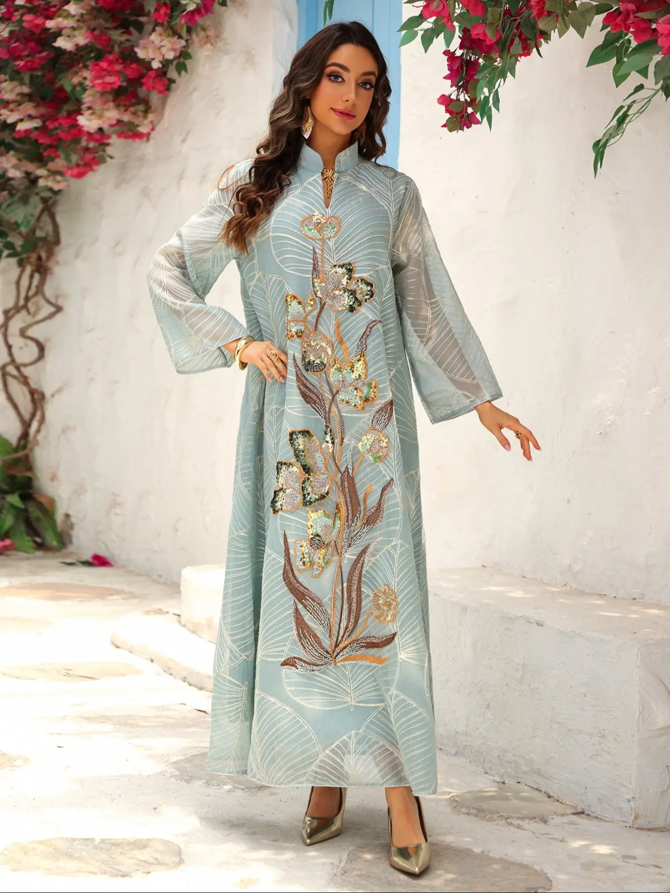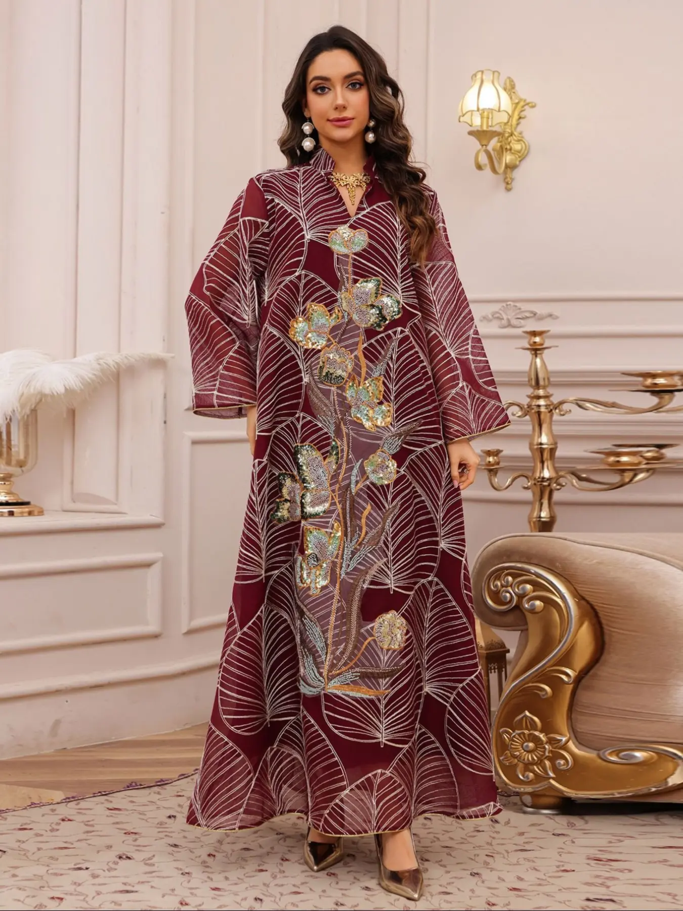 Traditional Style Women's Sequined Mesh Kaftan Dress, Long Evening Gown Abaya, Middle Eastern Fashion, Perfect for Special Occasions, Womenswear