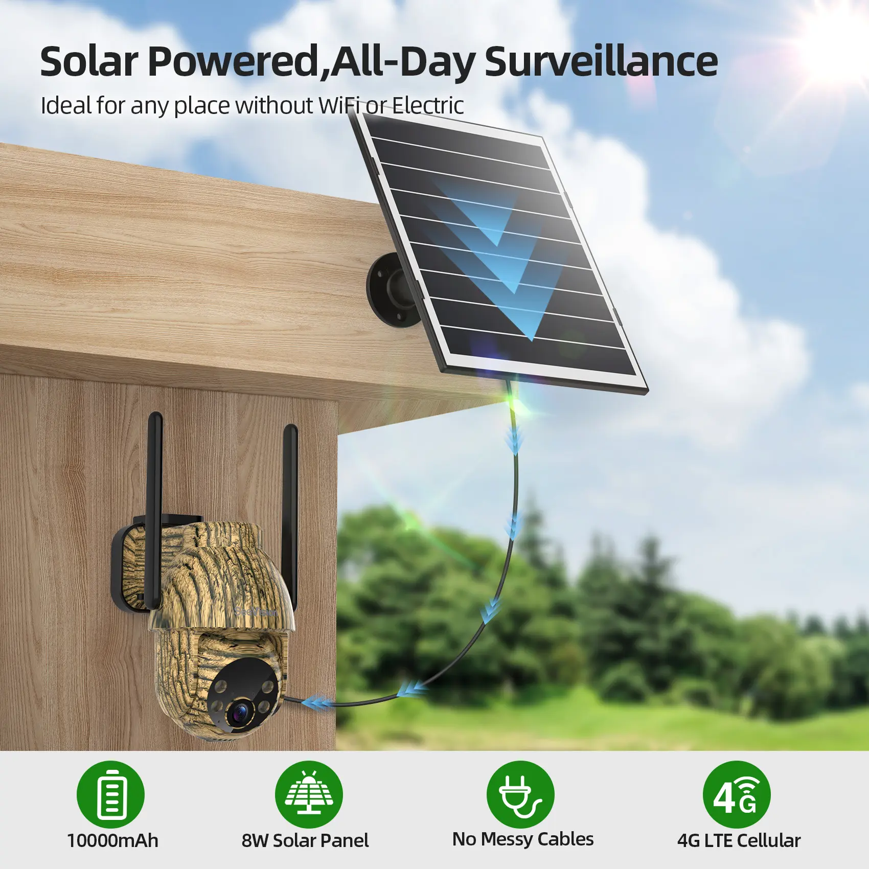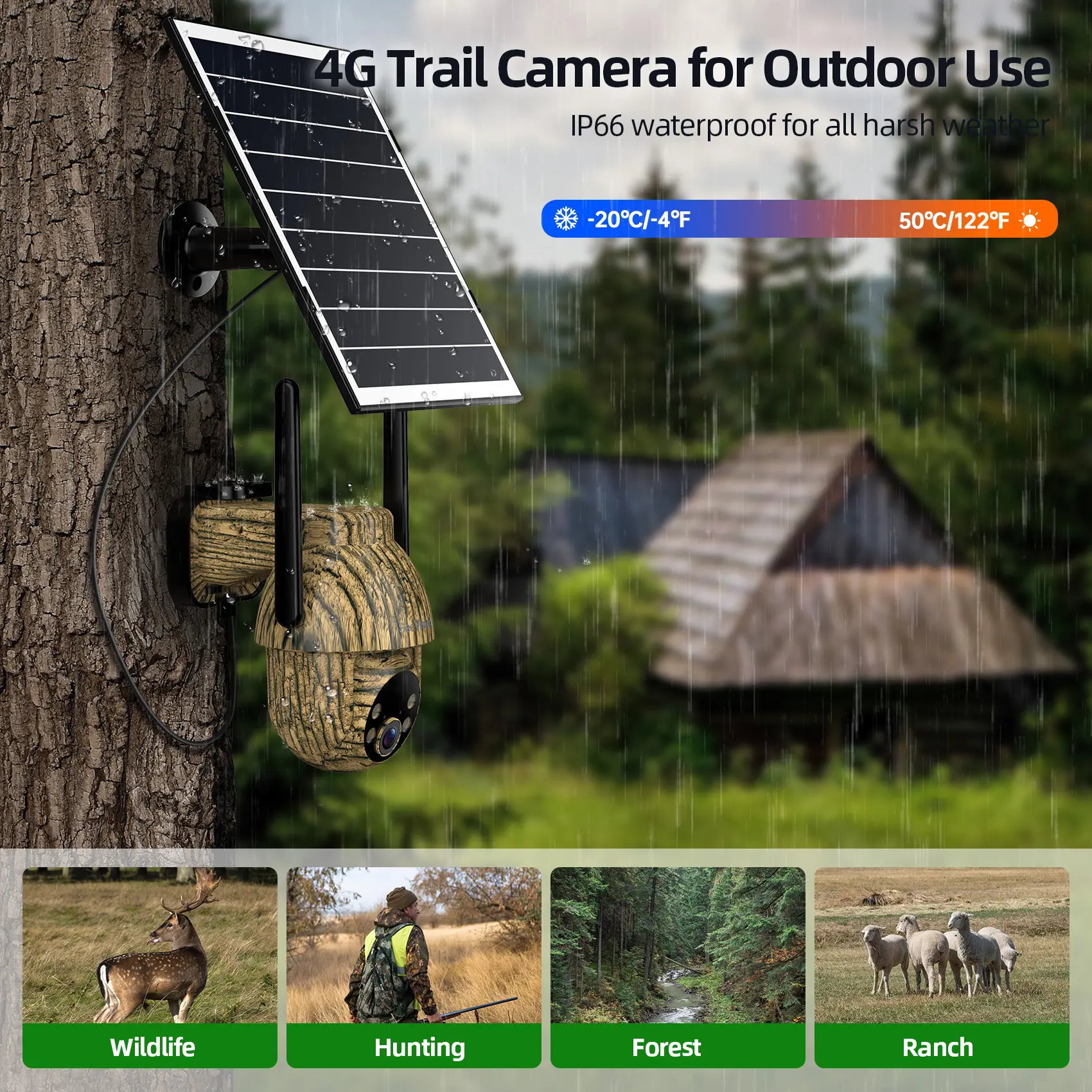 ·Battery & Wireless Solar Powered: Equipped with a 6W solar panel and 10400mAh rechargeable battery, providing enough power for the solar trail camera. IP65 waterproof for use in various environments, perfect for wildlife areas, barns, farms, construction sites, land properties, ranches, cabins, and motor homes.