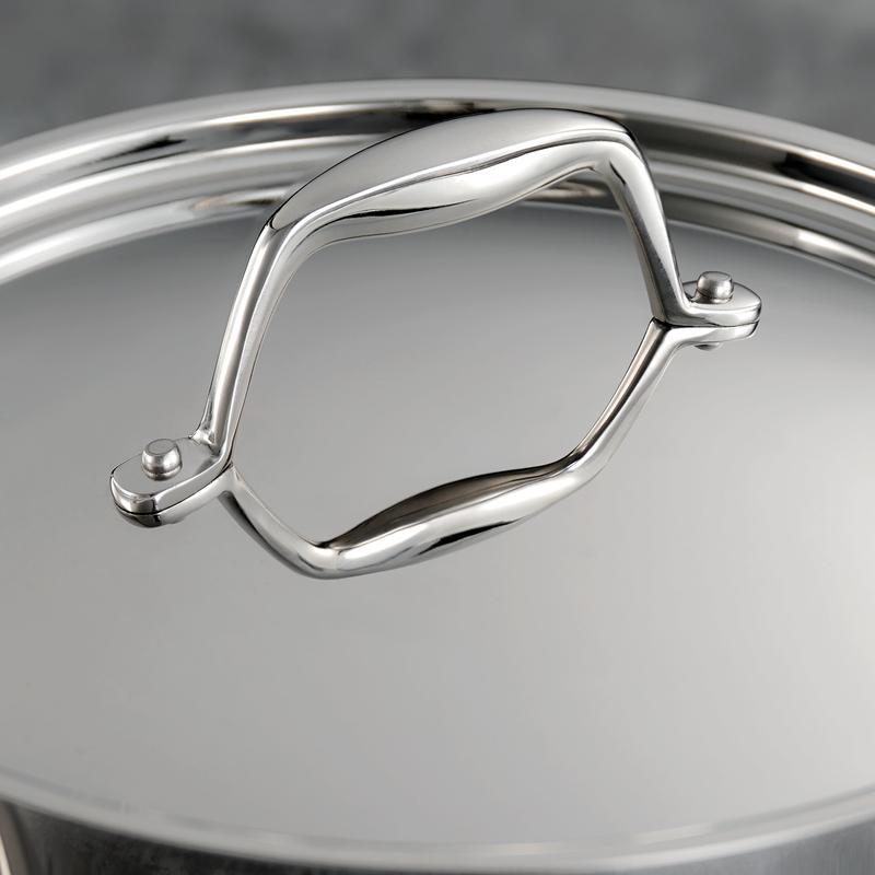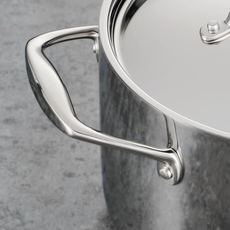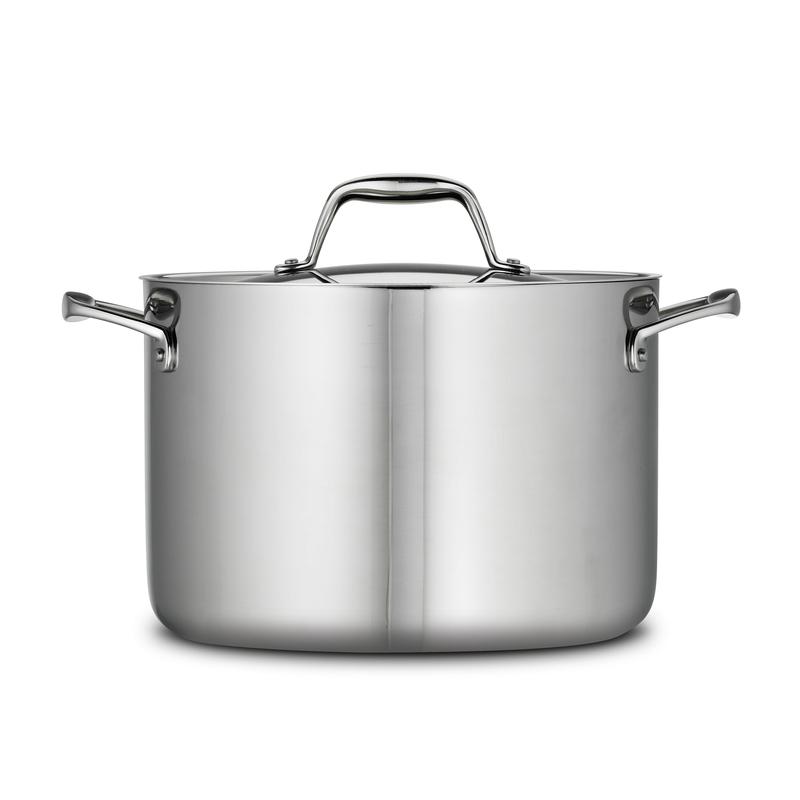 The Tramontina 8-Quart Tri-Ply Clad Stainless Steel Covered Stock Pot is a great choice for home and professional kitchens. The 8-quart capacity gives you plenty of space to cook large batches, making it perfect for family meals and meal prepping. Featuring tri-ply construction with an aluminum core surrounded by two layers of 18/10 stainless steel. This design ensures even heat distribution, reducing hot spots and giving you more control over your cooking. Create gourmet meals for 8 to 12 people with this 8-quart stock pot, perfect for crafting everything from spaghetti and soups to rich stocks and homemade broths. Designed for experienced chefs, its stainless steel lid locks in heat and moisture, making it ideal for slow-cooking exquisite soups, hearty stews, and luxurious sauces. The stock pot is NSF-certified, meeting the highest standards for safety and quality. Designed for use in both home and professional kitchens, it's compatible with all cooktops, including gas, electric, ceramic glass, and induction. It's oven-safe up to 500°F offering plenty of cooking options. Its sturdy handles are riveted for extra strength and make it easy to move around, even when full. This stock pot has a mirror-polished exterior that gives it a sleek, professional look, perfect for both cooking and serving. For best results, we recommend handwashing and using non-abrasive sponges, though it is also dishwasher-safe for added convenience. Whether you're feeding your family or entertaining guests, the Tramontina stock pot is a must-have for your kitchen. It's especially handy for boiling pasta, making it a great spaghetti pot.
