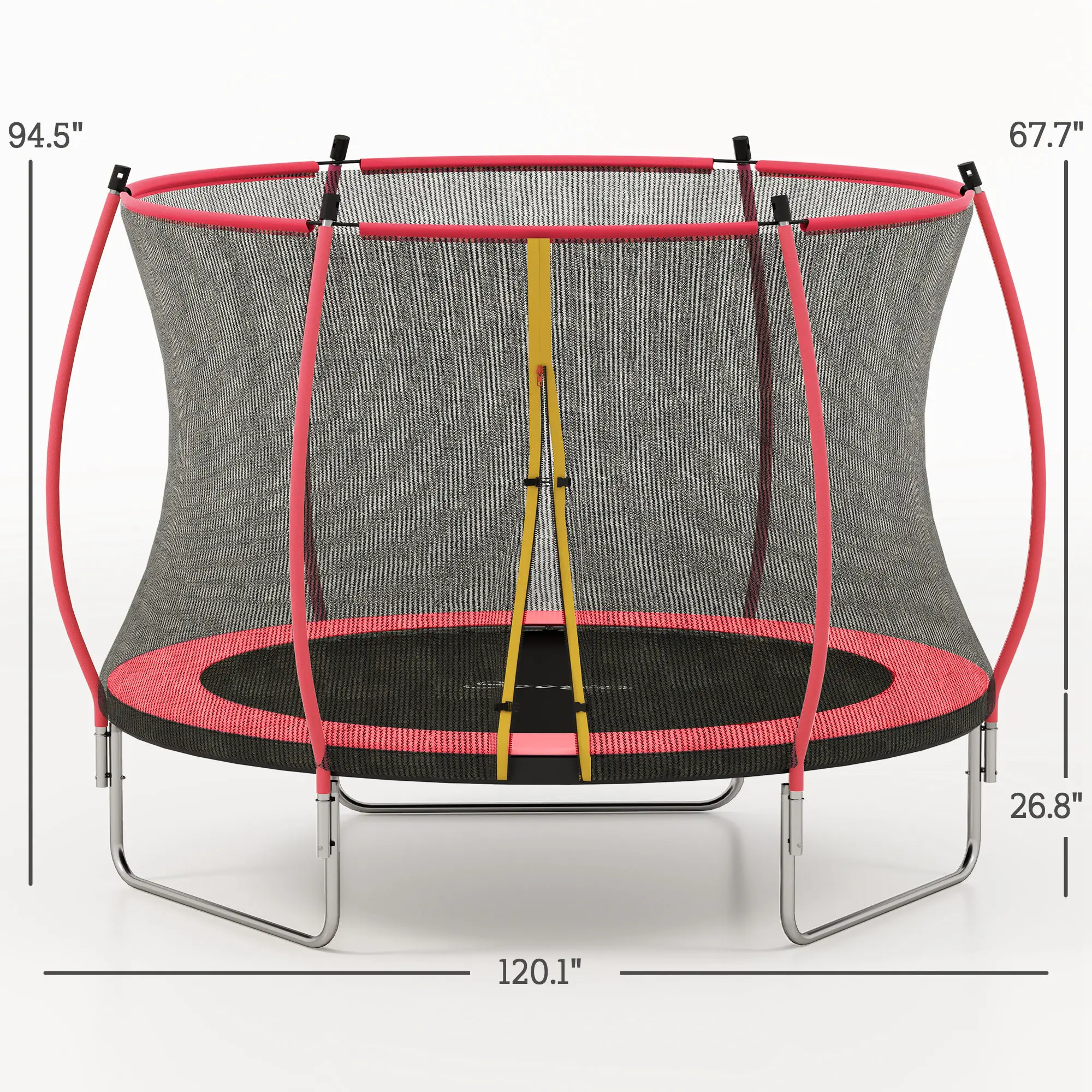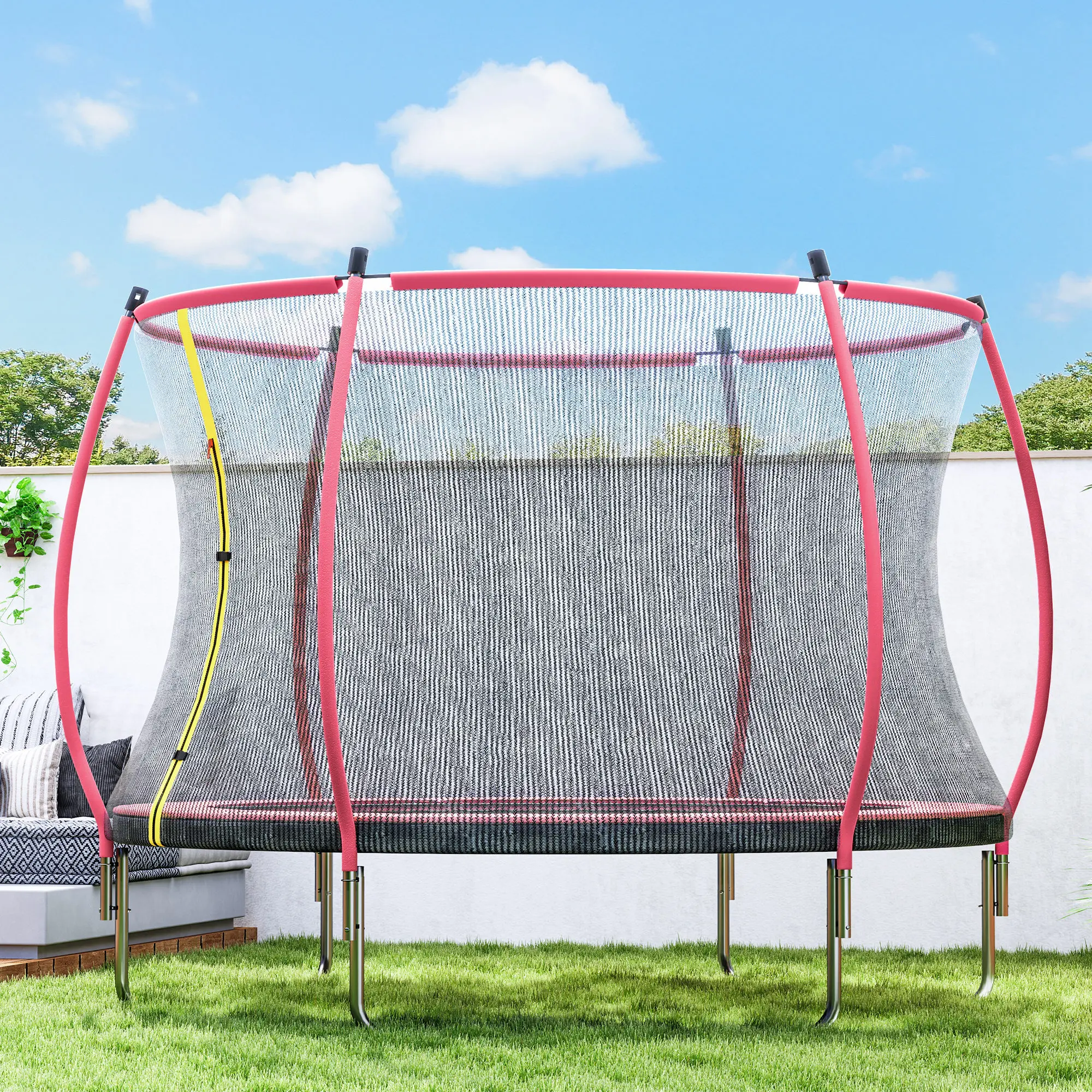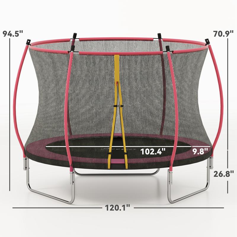 Leap into fun with the Soozier kids trampoline with enclosure! Featuring safe padding and curved poles for fewer injuries, and 54 high-tension springs for sky-high jumps. Its U-shaped feet ensure even stability, making it the great backyard trampoline. Plus, the double-sided zipper door makes access a breeze. Enjoy safer, joyful bouncing in your own outdoor space!