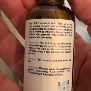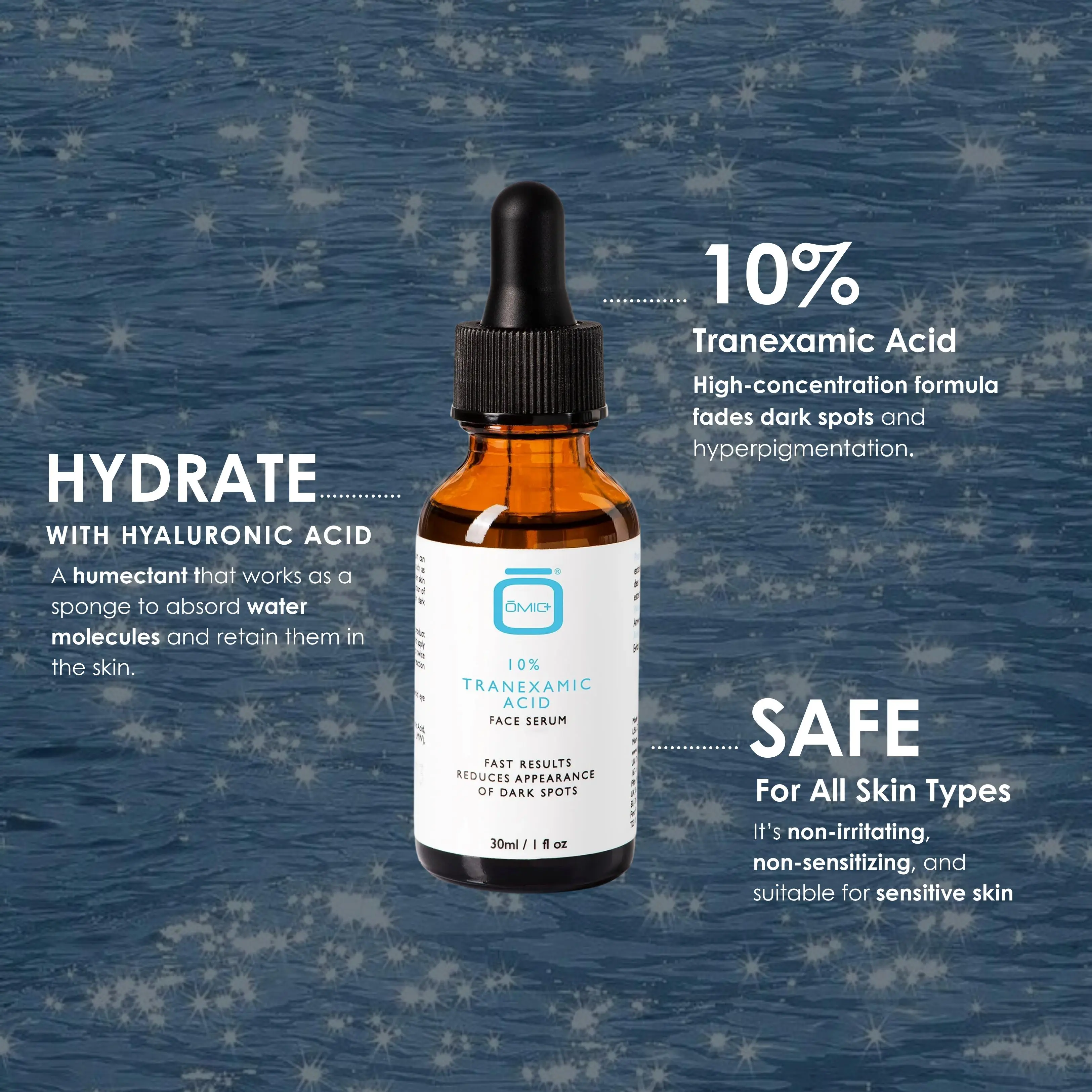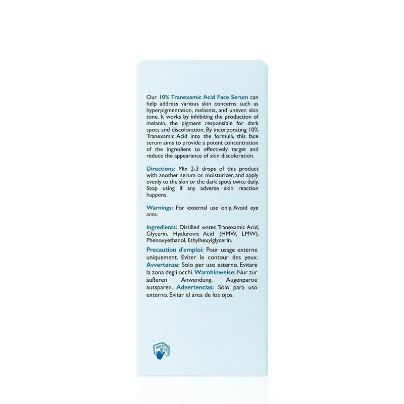 Our 10% Tranexamic Acid Face Serum is specially formulated to address concerns such as hyperpigmentation, melasma, and uneven skin tone. With a potent 10% concentration of Tranexamic Acid, this serum helps to reduce the appearance of discoloration by gently balancing melanin production. Incorporating this serum into your routine can promote a more even and radiant complexion.