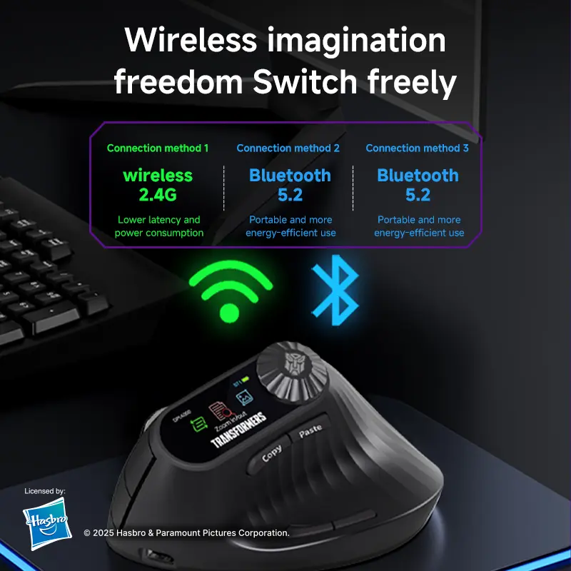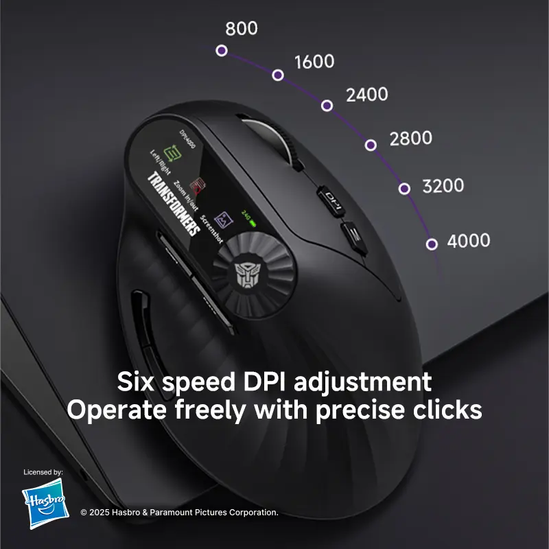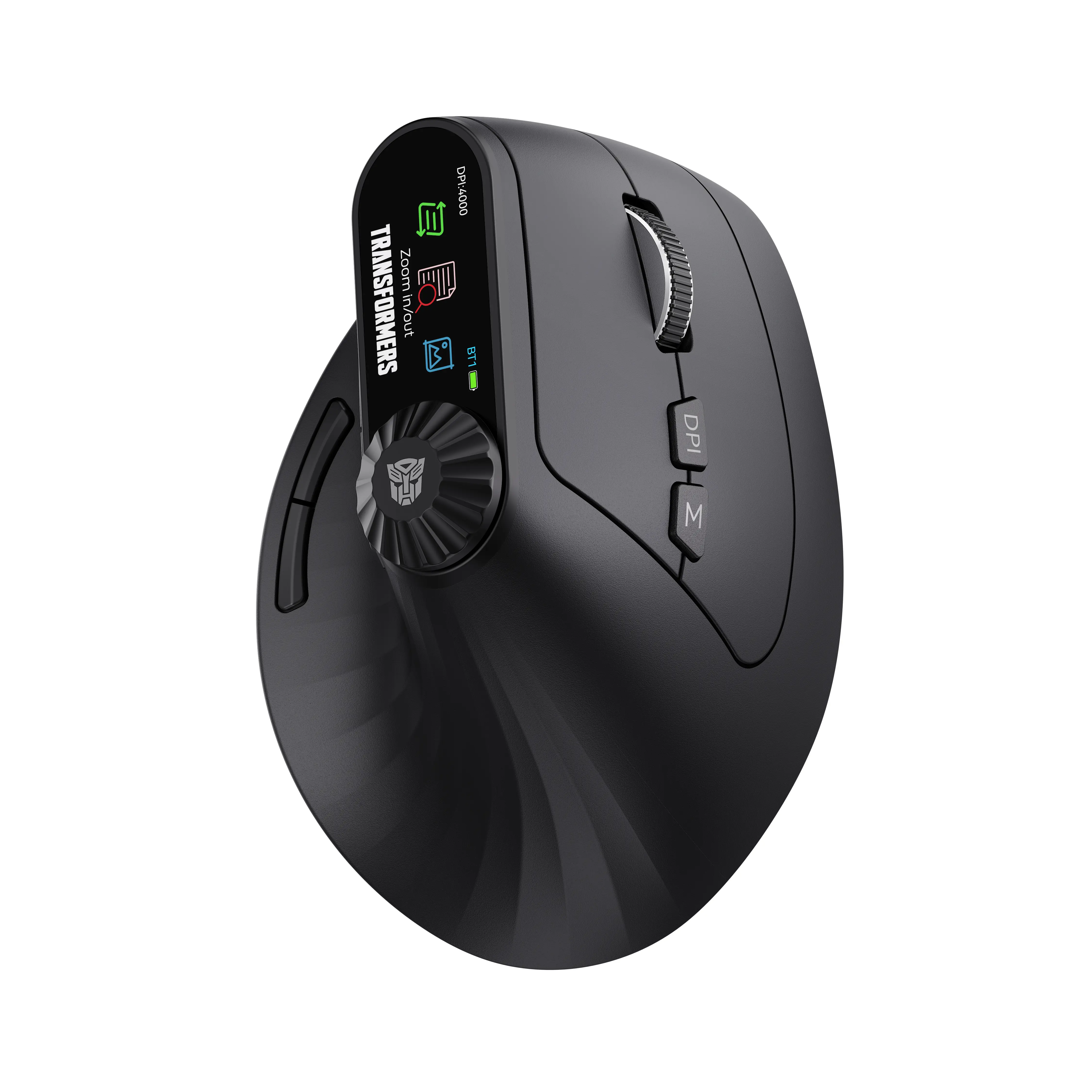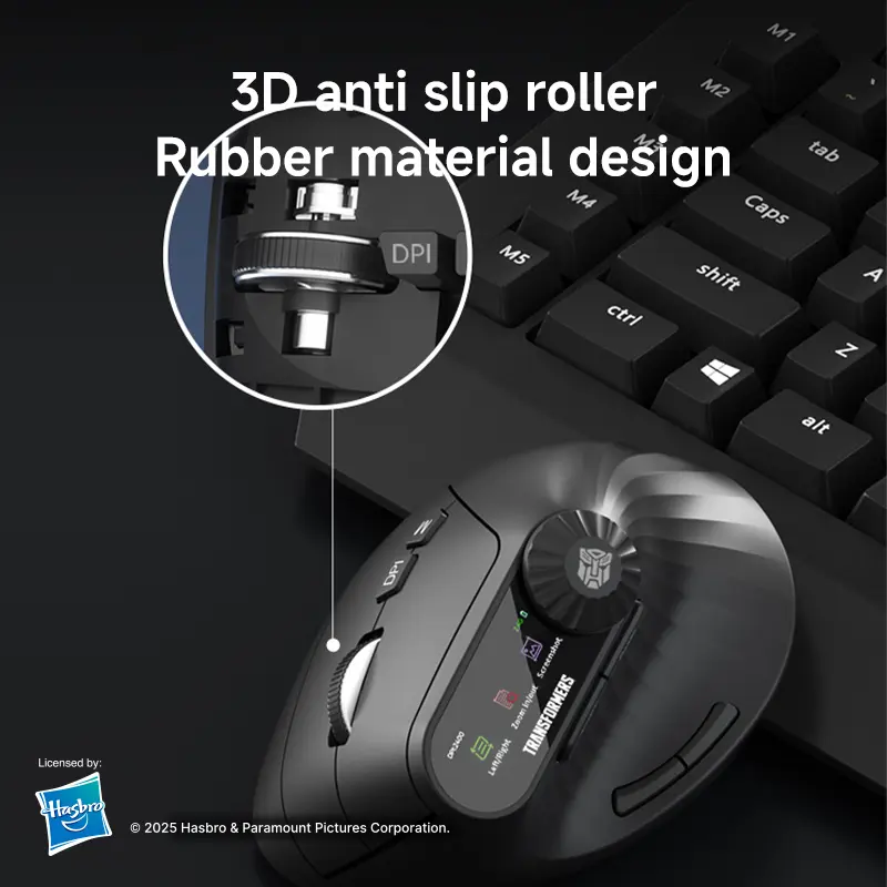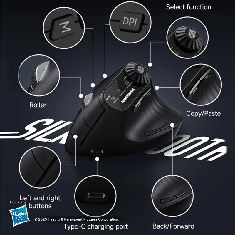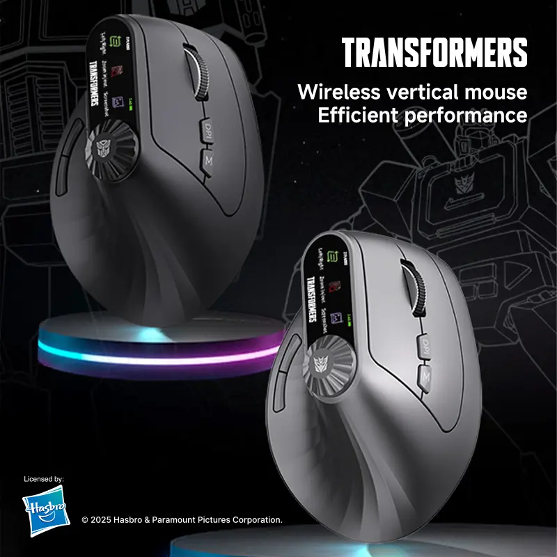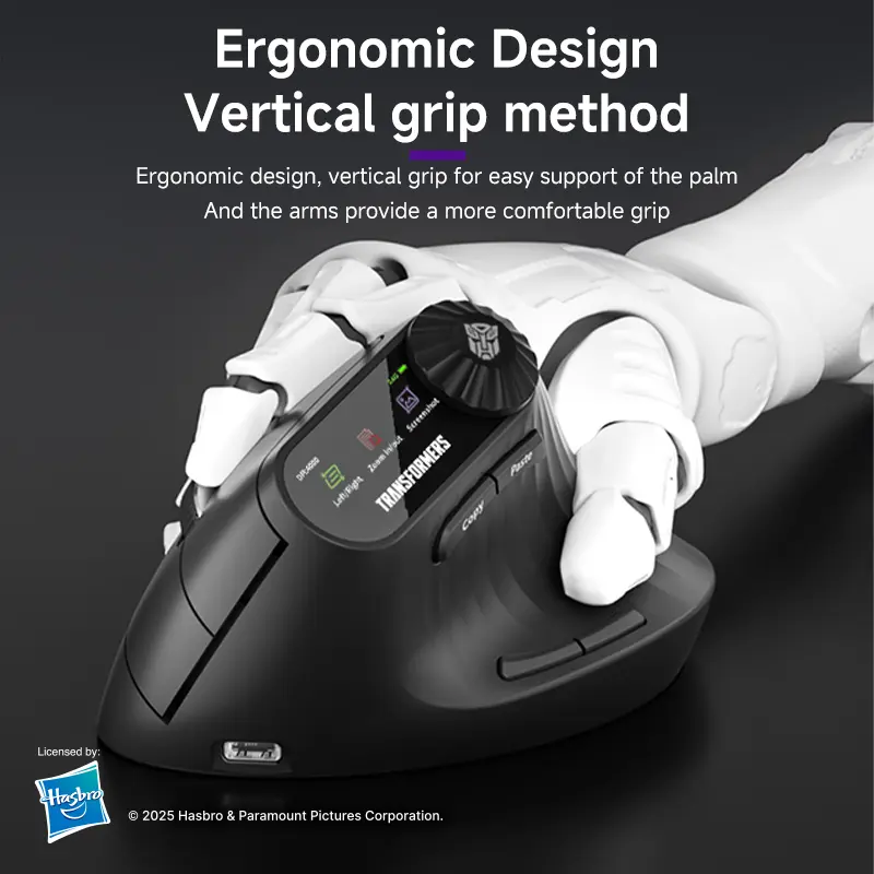 Elevate your mouse experience with the Transformers TF-VM01 Vertical Mouse. This wireless Bluetooth dual-mode mouse is designed for medium and large hands, ensuring a comfortable grip. It's rechargeable and portable, perfect for office laptops. The sleek black design complements any setup. Ideal for users seeking a silent, efficient mouse.