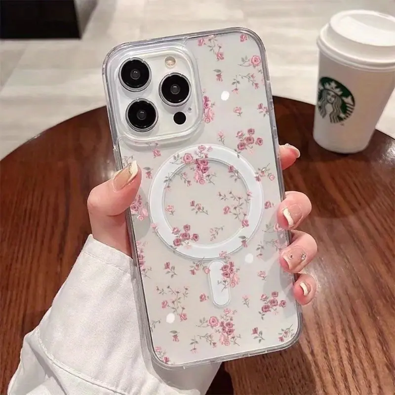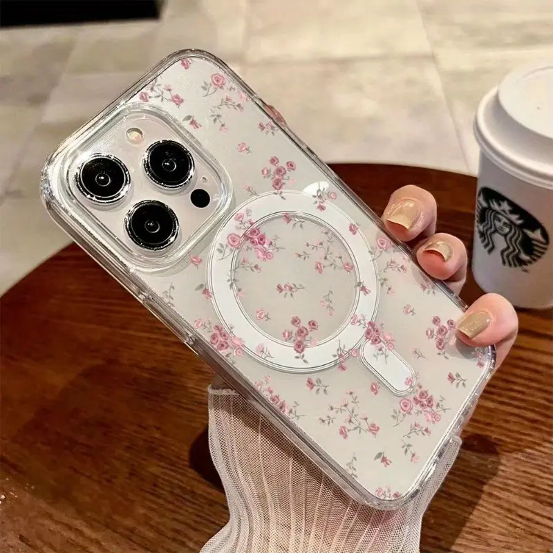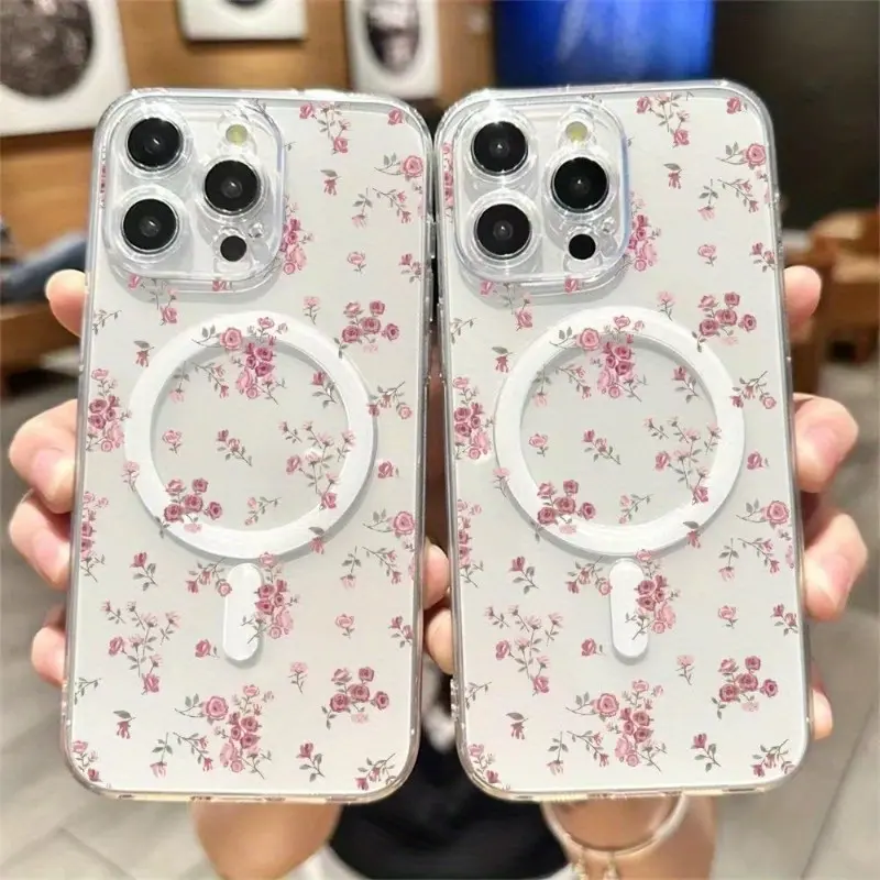 A Fully Transparent Phone Case with a Floral Design Magnetic Case for iPhone 17 Pro Max Air 16 16e 15 14 Plus 13 12 11 X XS Transparent Acrylic Scratch-resistant skin-friendly feel Smartphone Cover Gift